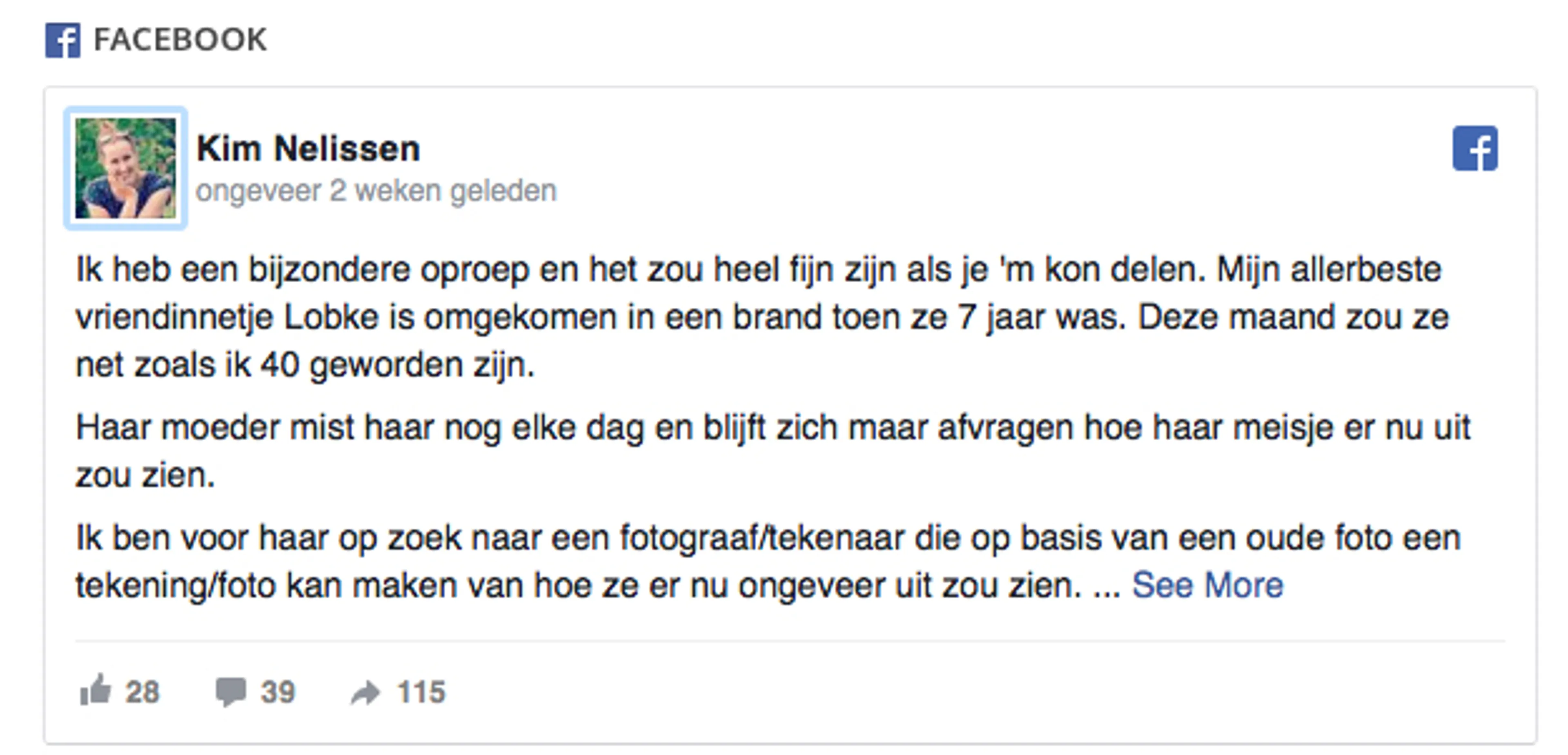 Nelissen voegde daar aan toe dat zij op zoek is naar een tekenaar die op basis van een oude foto een portret van Lobke kan maken. Haar vraag werd massaal gedeeld.