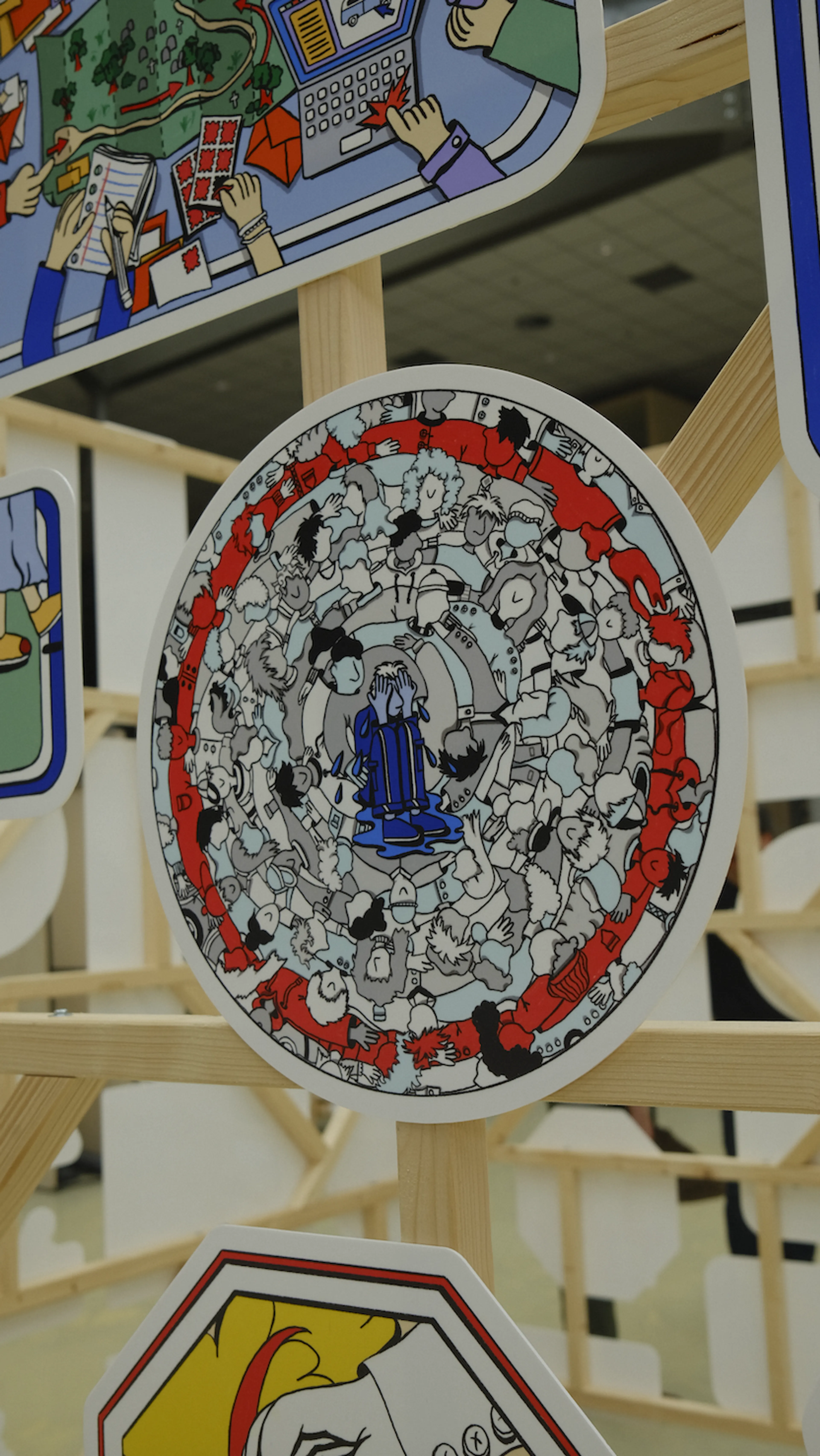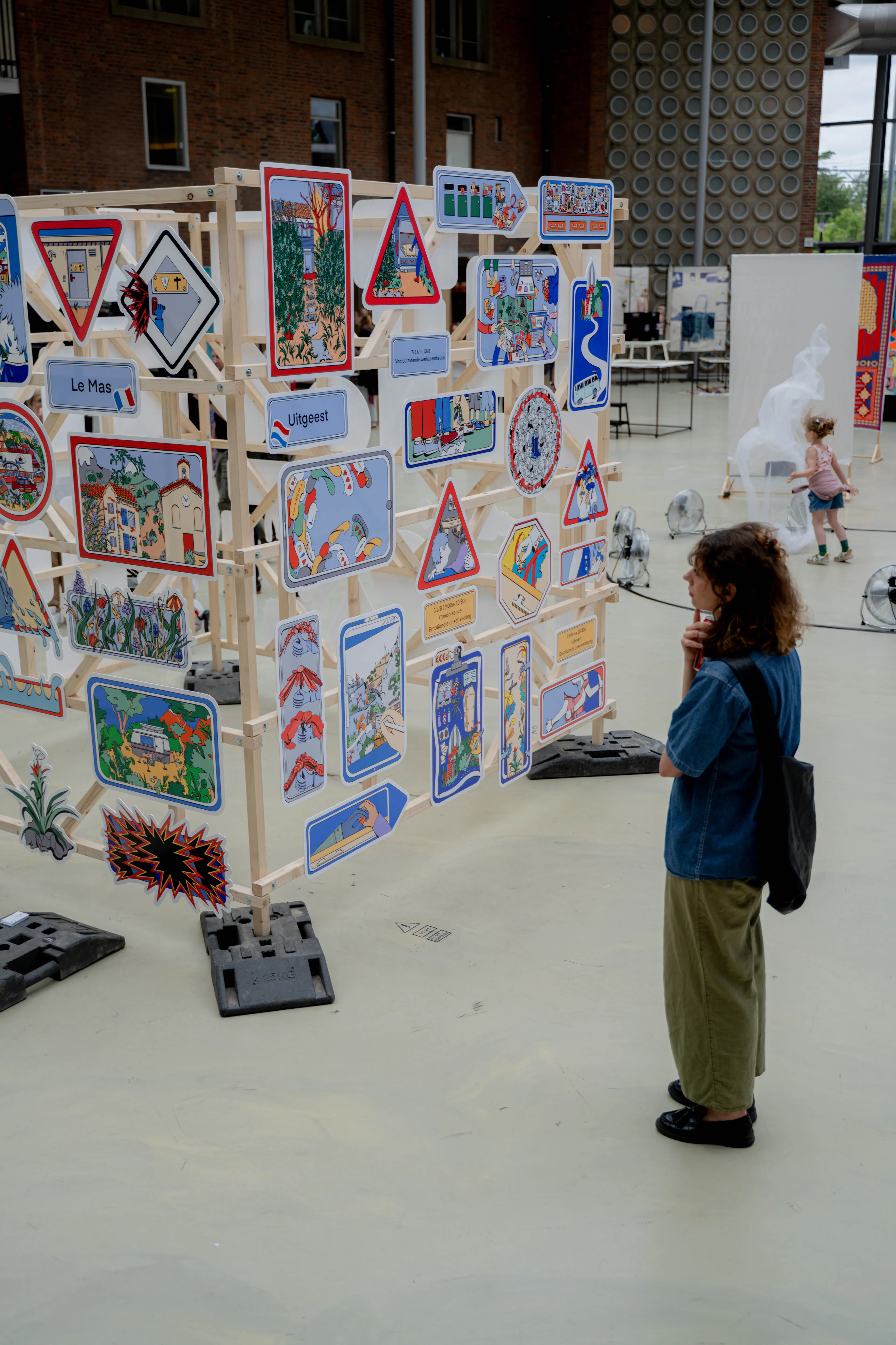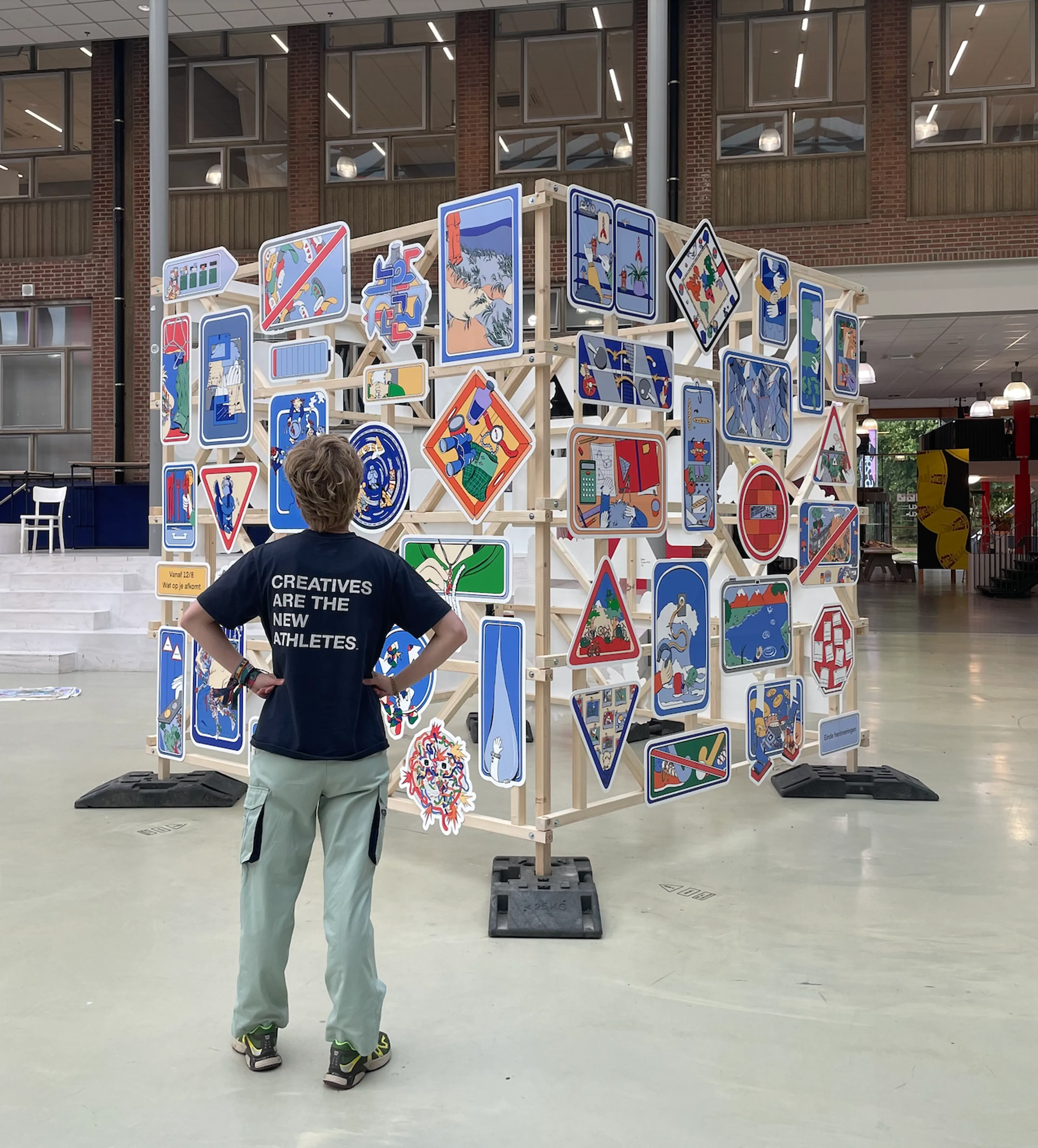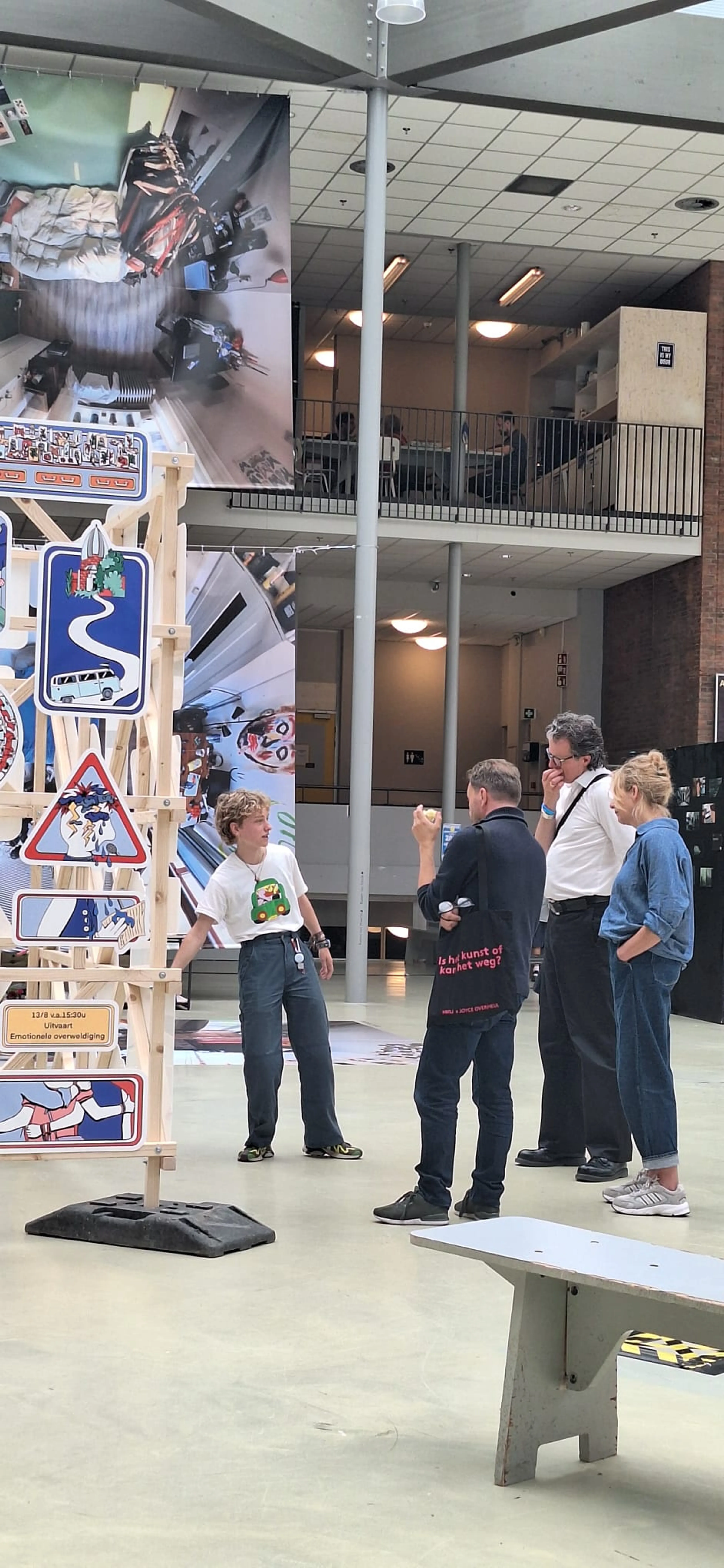 Het wordt een grote installatie die bestaat uit 92 verkeersborden die samen een verkeersinfarct uitbeelden. Je kunt niet terug, je kunt niet verder. Een spreekwoordelijke ochtendspits, je zit klem, opgesloten. De vele verkeersborden helpen niet en wijzen je niet in de juiste richting.