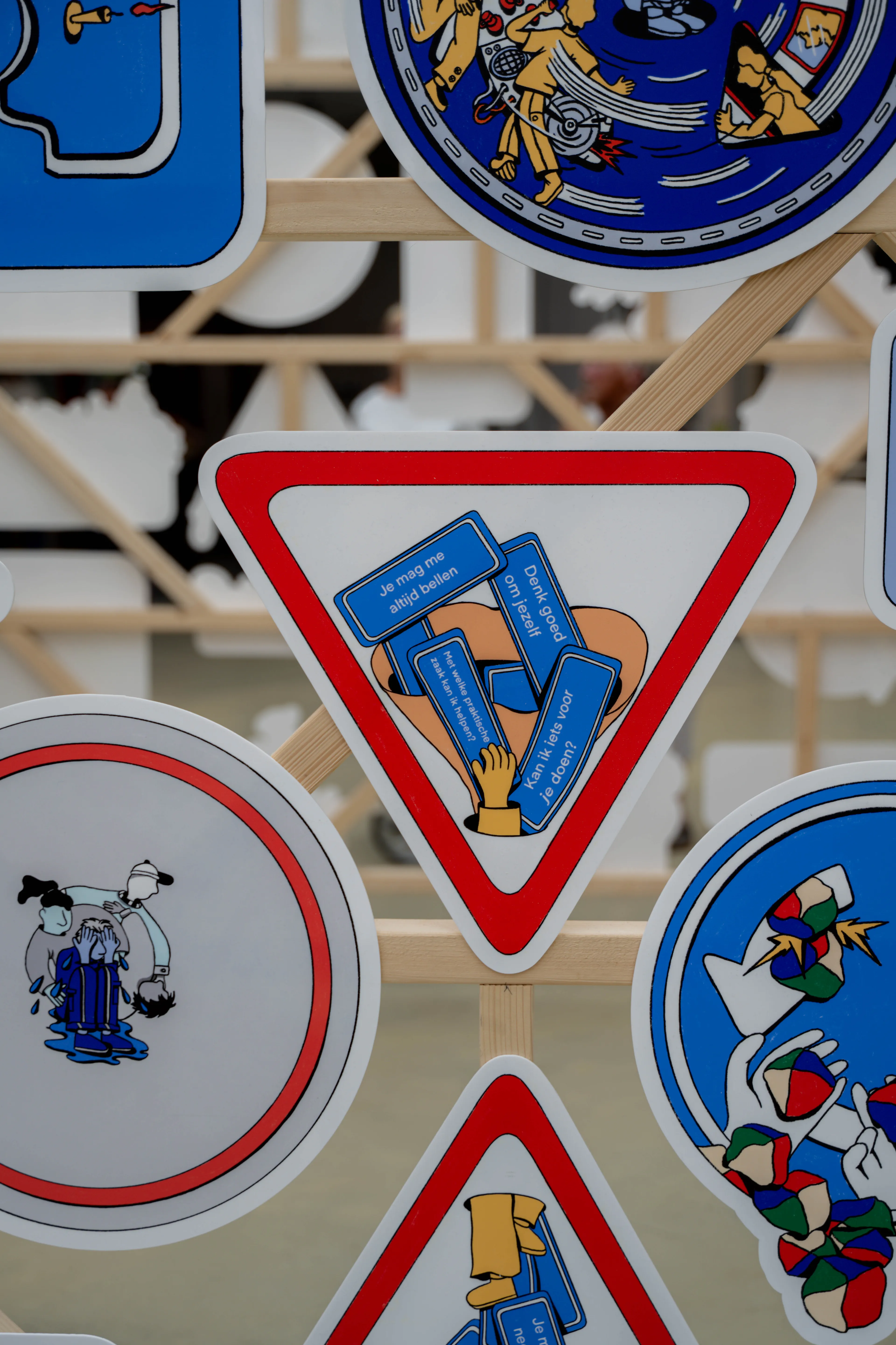 Zo heeft ze van verkeersborden een zandloper gemaakt. Twee driehoeken op elkaar. Het bovenste deel is gevuld met opmerkingen zoals: “Ik ben er altijd voor je”, “Je mag me altijd bellen”, en het onderste deel met: “Je ziet er gelukkig uit, is de storm al gaan liggen?” Dit is wat mensen soms zeggen.