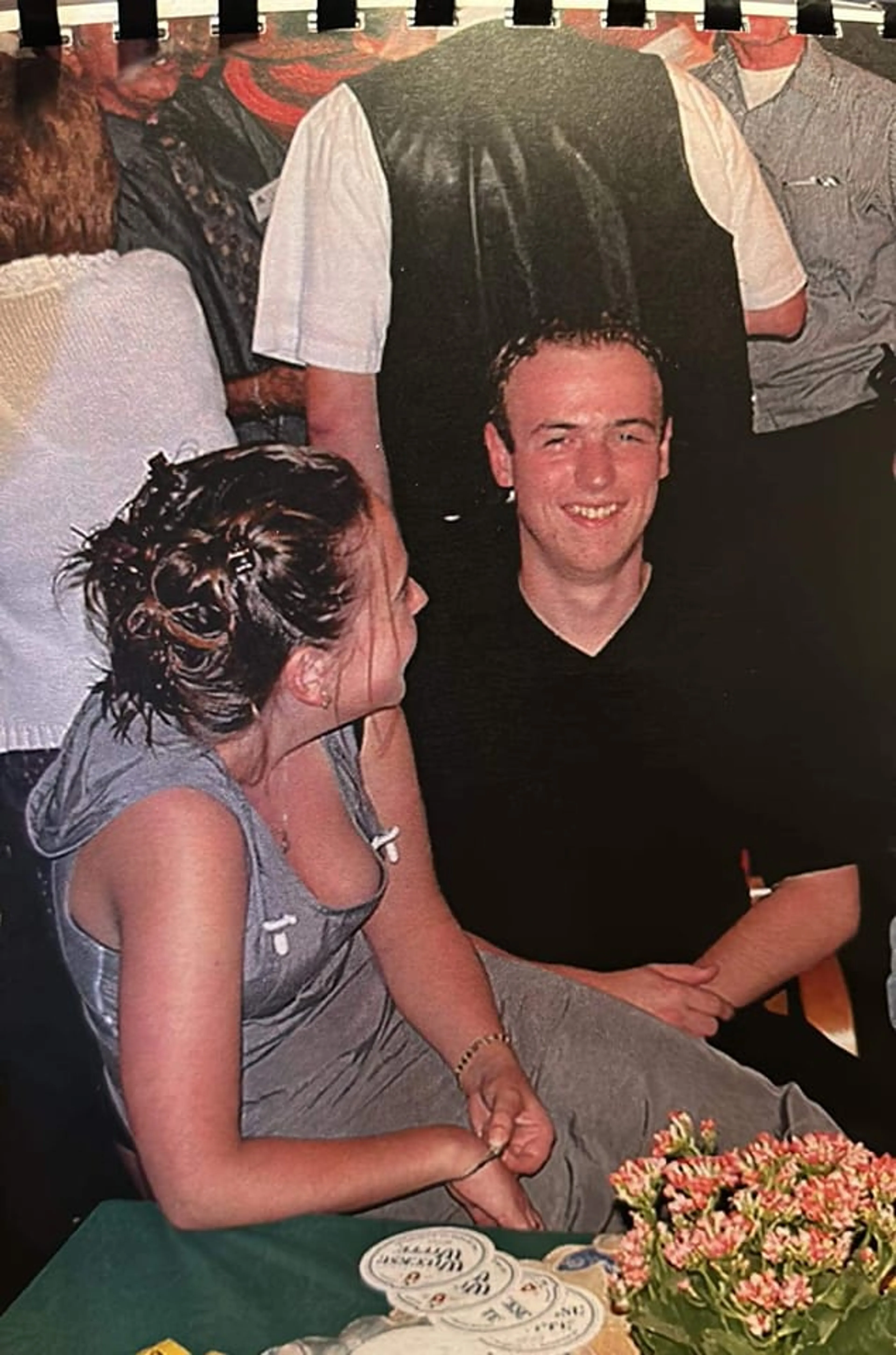 Het is een foto van dik 23 jaar geleden. Genomen op een reünie van de tafeltennisclub waar ik bij was. Deze foto ken ik nog niet, dat maakt het extra bijzonder. Paul en ik zijn daar net geen twee jaar samen. Poeh, wat waren we nog jong; 20 en 19.