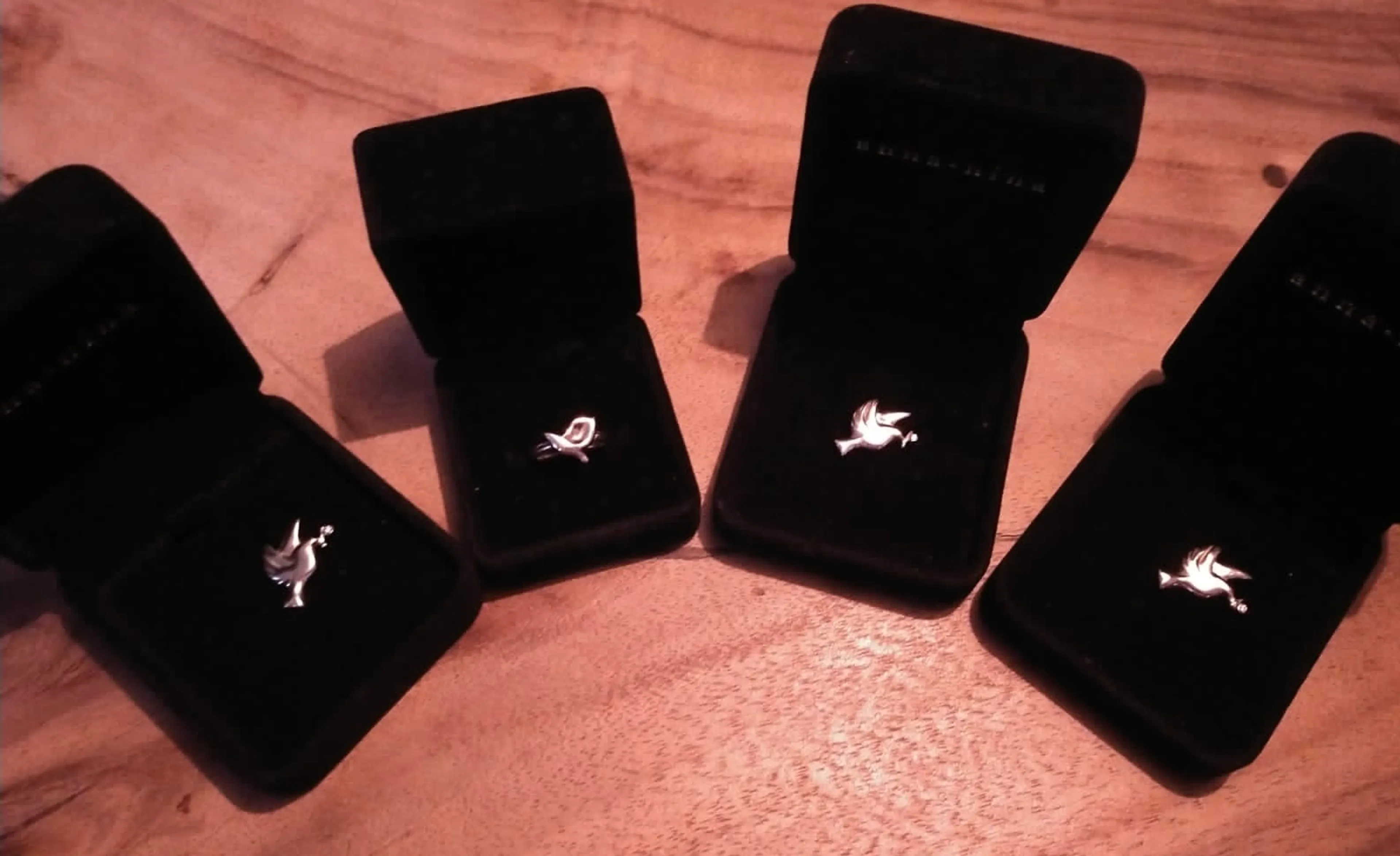 De oudste en ik stappen het atelier binnen. De zwarte fluwelen doosjes worden op rij neergezet en gaan open. En dan worden we stil. We bewonderen de prachtige kunstwerken. Drie stekers met elk een gouden duif voor de jongens. Elke duif heeft een takje in zijn bek met een van de steentjes uit mijn trouwring. Voor mij is er de trouwring van Koos, kleiner en smaller gemaakt. Met daarop ook ons symbool, de duif. Waar ik met enige regelmaat heb getwijfeld of ik er goed aan deed onze trouwringen te laten versmelten, kan ik nu alleen maar ontroerd kijken naar dit prachtige resultaat. Onze verbondenheid als gezin spreekt uit de sieraden.
