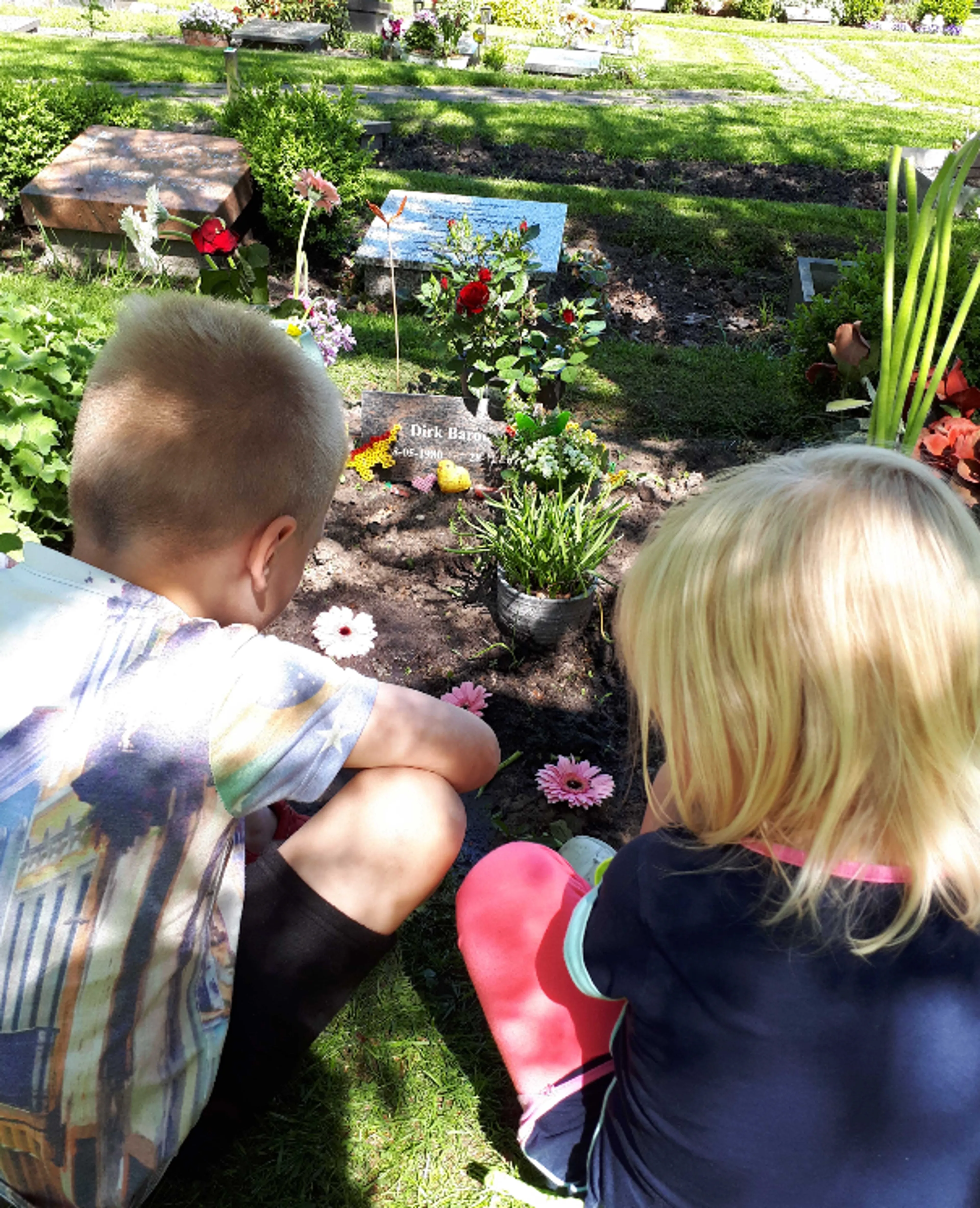 graf versierd, want dat hoort bij een verjaardag vonden de kinderen. Eenmaal bij het graf feliciteerden ze Dirk spontaan. Onze zoon keek om zich heen en zei, wijzend naar de andere graven: ‘Ik denk dat papa met alle mensen die hier ook zijn een feestje viert in de hemel’.