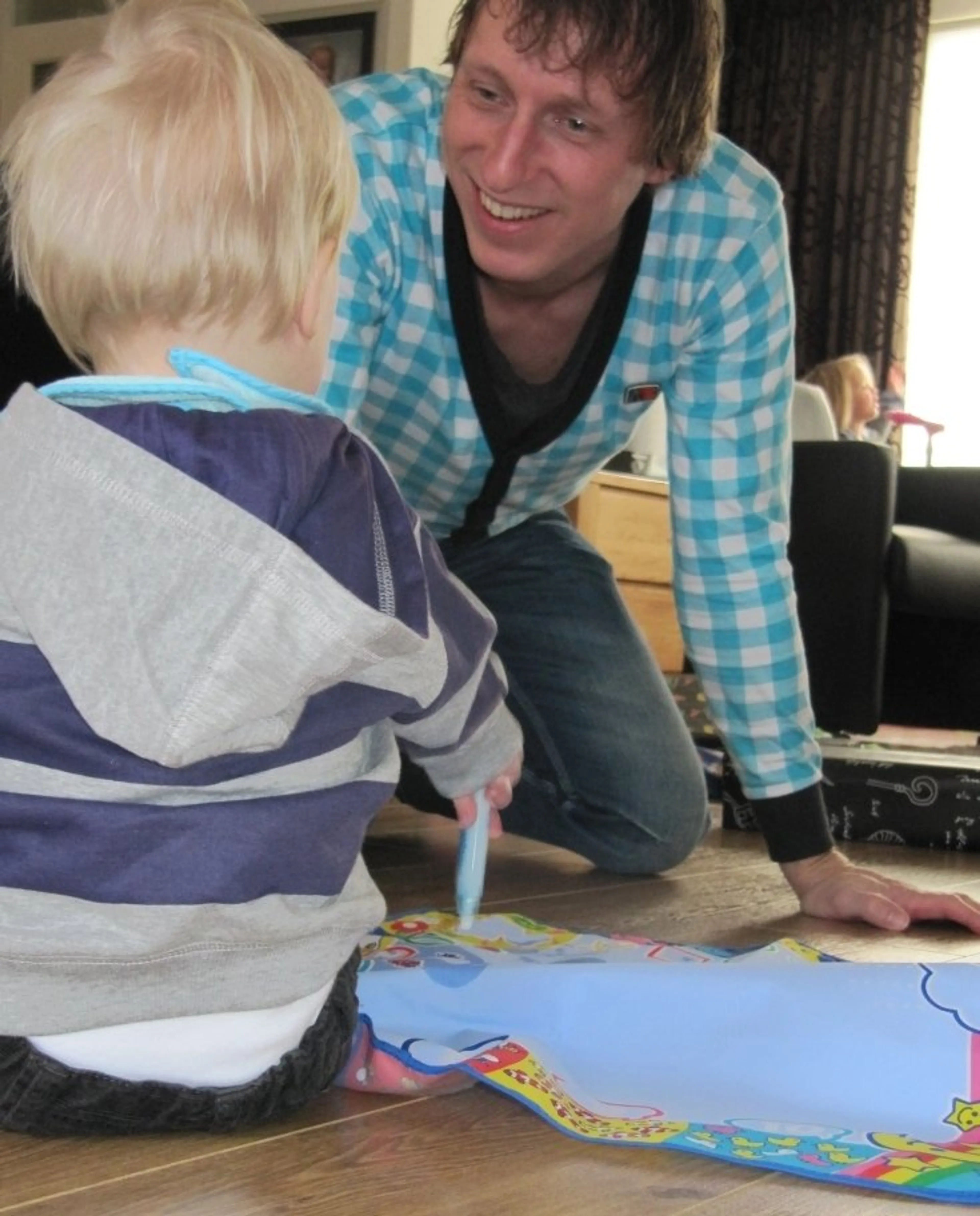 Na het eten zet ik de kinderen onder de douche en stoeien we nog wat op het grote bed. Inmiddels is Dennis beneden klaar met het opruimen en sluipt hij naar boven. Hij kruipt op handen en knieën langs het bed en schiet ineens overeind, pakt de kinderen vast en zet ze op zijn rug. Ze gieren van het lachen!