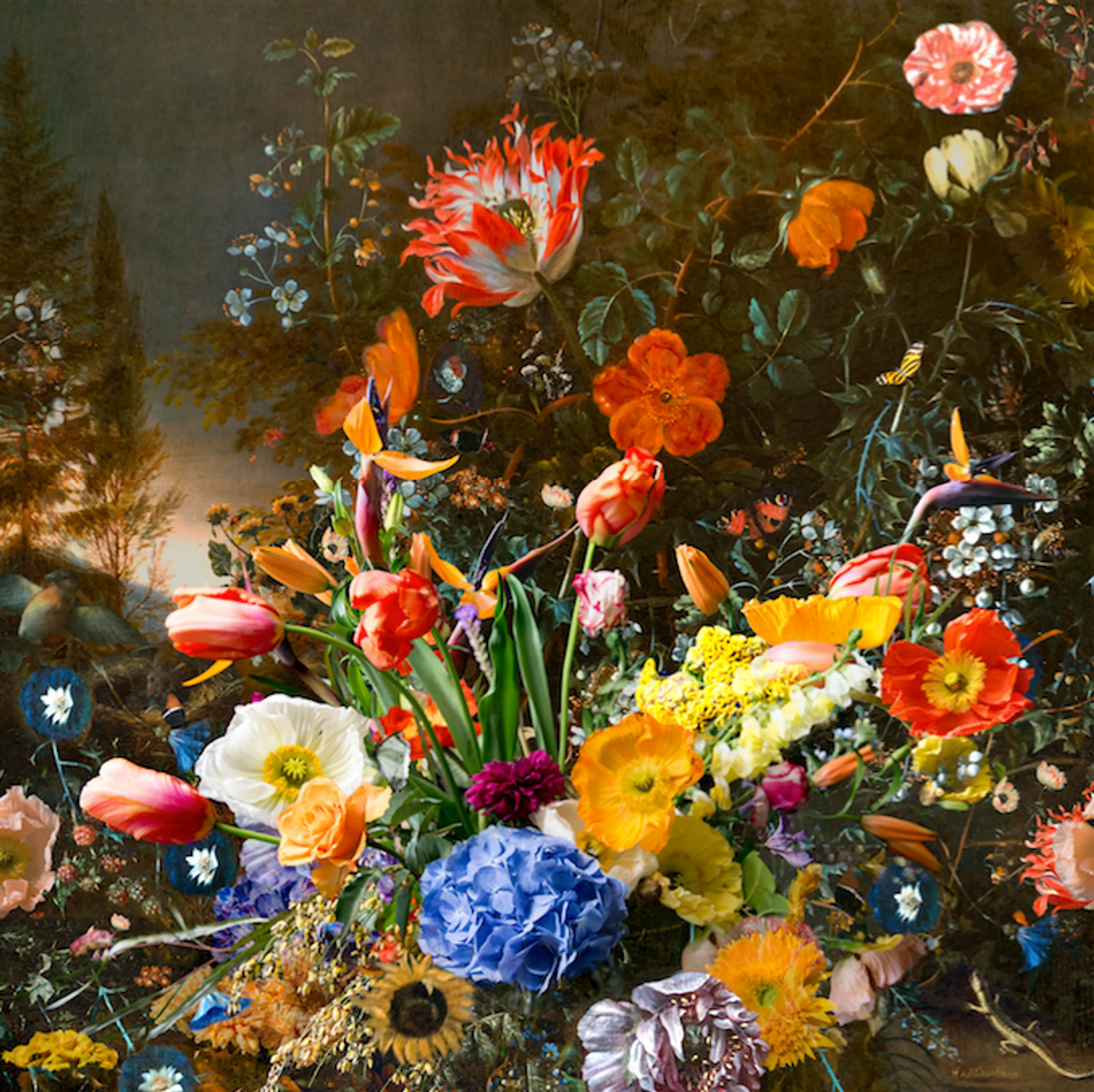 Hoeveel kleuren tel je, hoeveel verschillende soorten bloemen? Alles is máximaal, op het dramatische af. Bloemen die verwijzen naar het paradijs. Als je toch goed aan het kijken bent, ontdek je dat het ook een soort zoekplaatje is: Stilleven met bloemen en… een vogelnestje! Heb je het vogelnestje al gevonden? Ik ontdekte het zelf pas in tweede instantie.