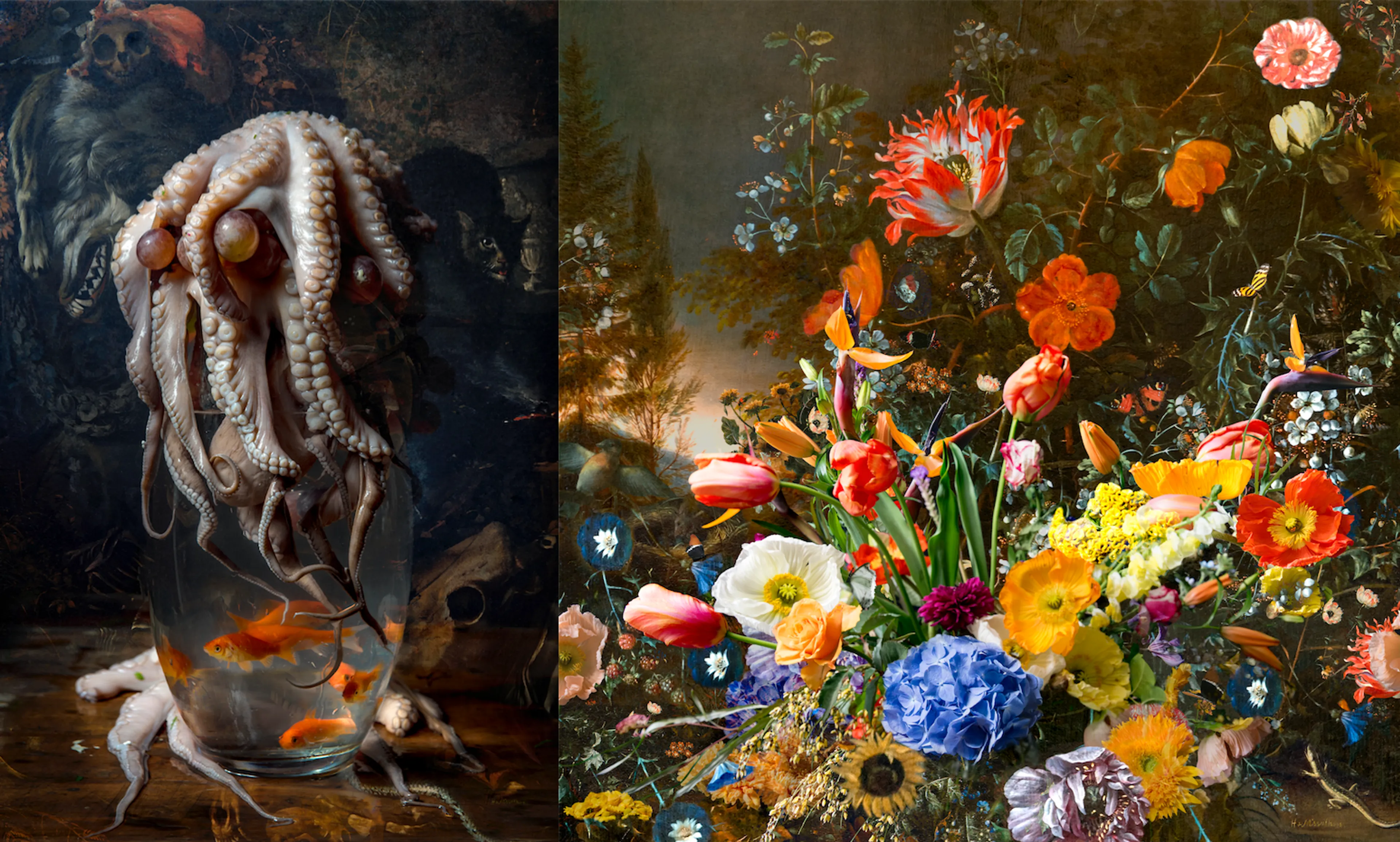 Beide kunstwerken zijn gemaakt door de Rotterdamse fotograaf Hans Withoos (1962). Hij is een verre nazaat van de 17e eeuwse fijnschilder Matthias Withoos. Voor de expositie Withoos meets Withoos in het Westfries Museum liet Hans zich inspireren door het werk van zijn betovergrootvader. Het resultaat zijn veertig spannende fotografische beeldbewerkingen, waaronder bovenstaande twee.