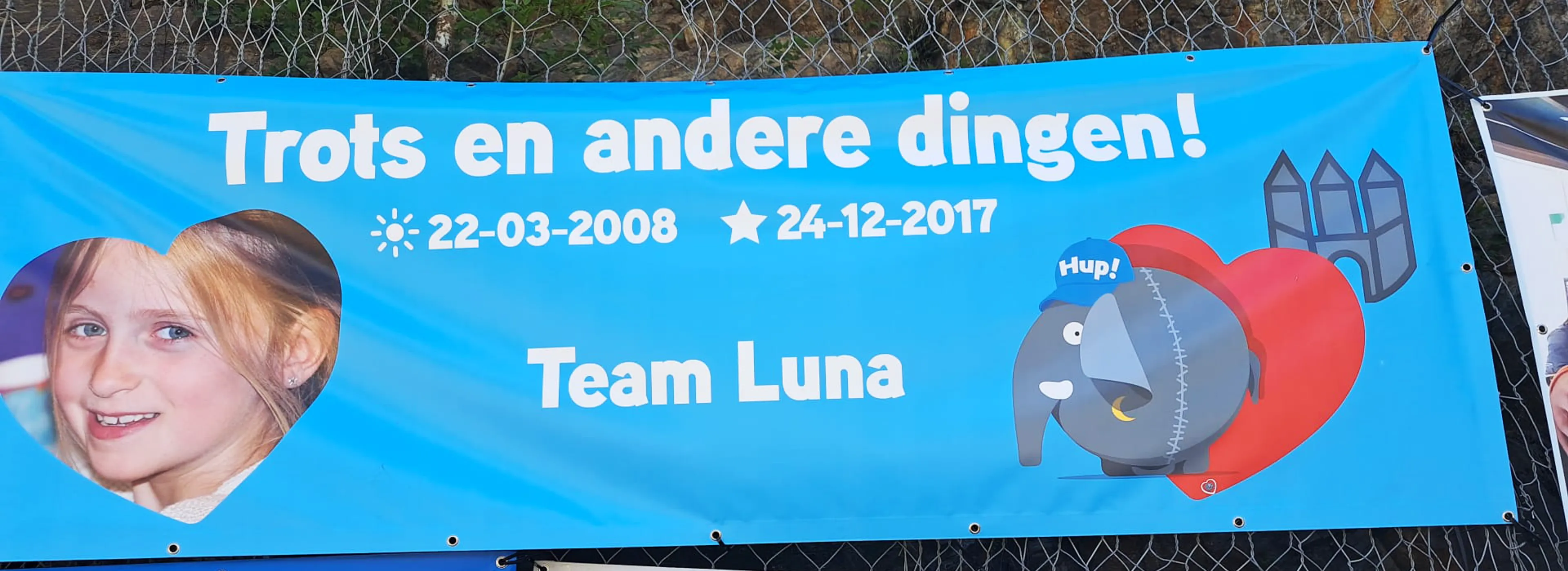 Omdat dit onze derde keer is, weten we precies wat we moeten doen. We gaan eerst naar de gedenkmuur om onze “hartenkreten” op te schrijven en foto’s van Luna op te hangen. Hierna schrijven we de labels van de kaarsen die in bocht negen neergezet worden en we leveren het spandoek van Luna in dat ook in bocht negen gehangen wordt.