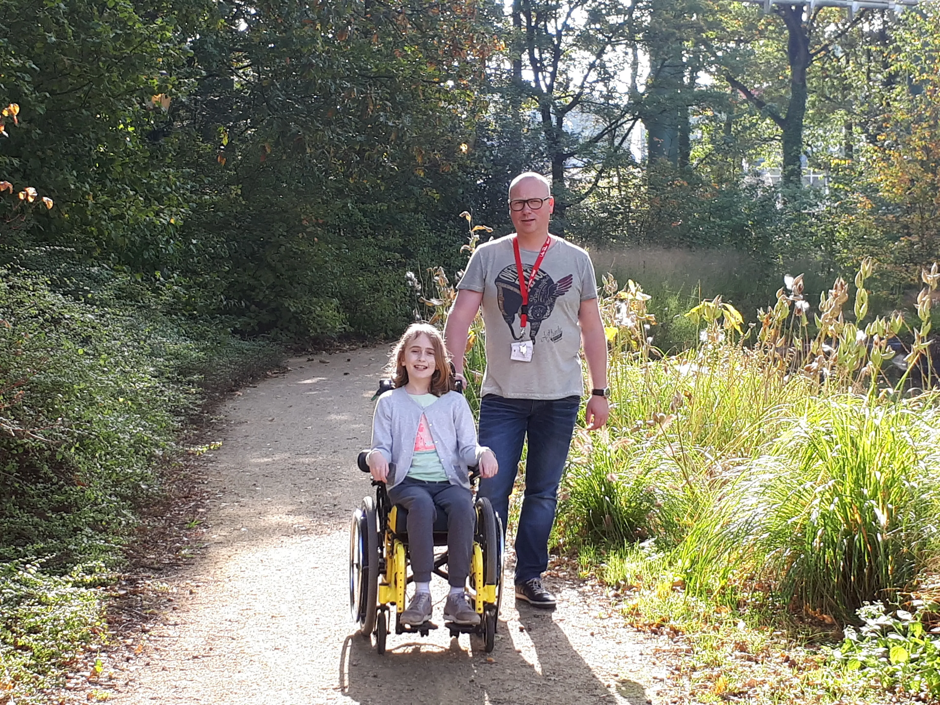 Als ik bij mijn auto aankom, zie ik een oudere man in een rolstoel over het wandelpad richting mijn auto geduwd komen. Er lopen twee jongere personen naast hem die ieder met één hand de rolstoel vooruitduwen. Het is een bijzonder gezicht, want waarom loop je niet achter de rolstoel?