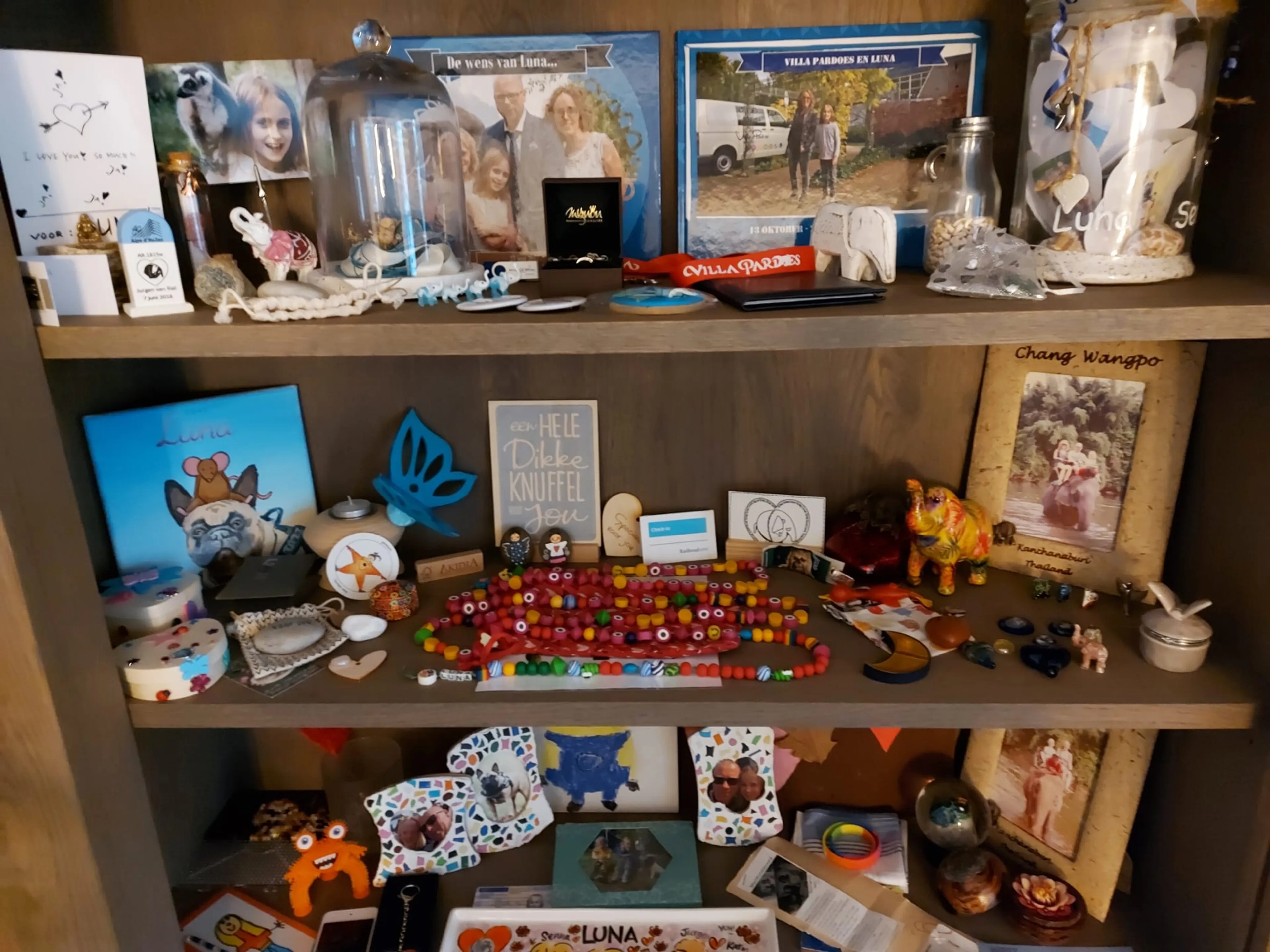 Het mooie van de kast is: als ik een moment uitkies, haal ik dat helemaal terug in mijn gedachten en beleving nu. Ineens hoor ik dan Luna’s stem weer, of ruik ik haar. Ik raak er niet meer van in paniek. Als het komt, dan komt het. Is het er een keer niet, dan zal ze het wel te druk hebben, waar ze ook is.