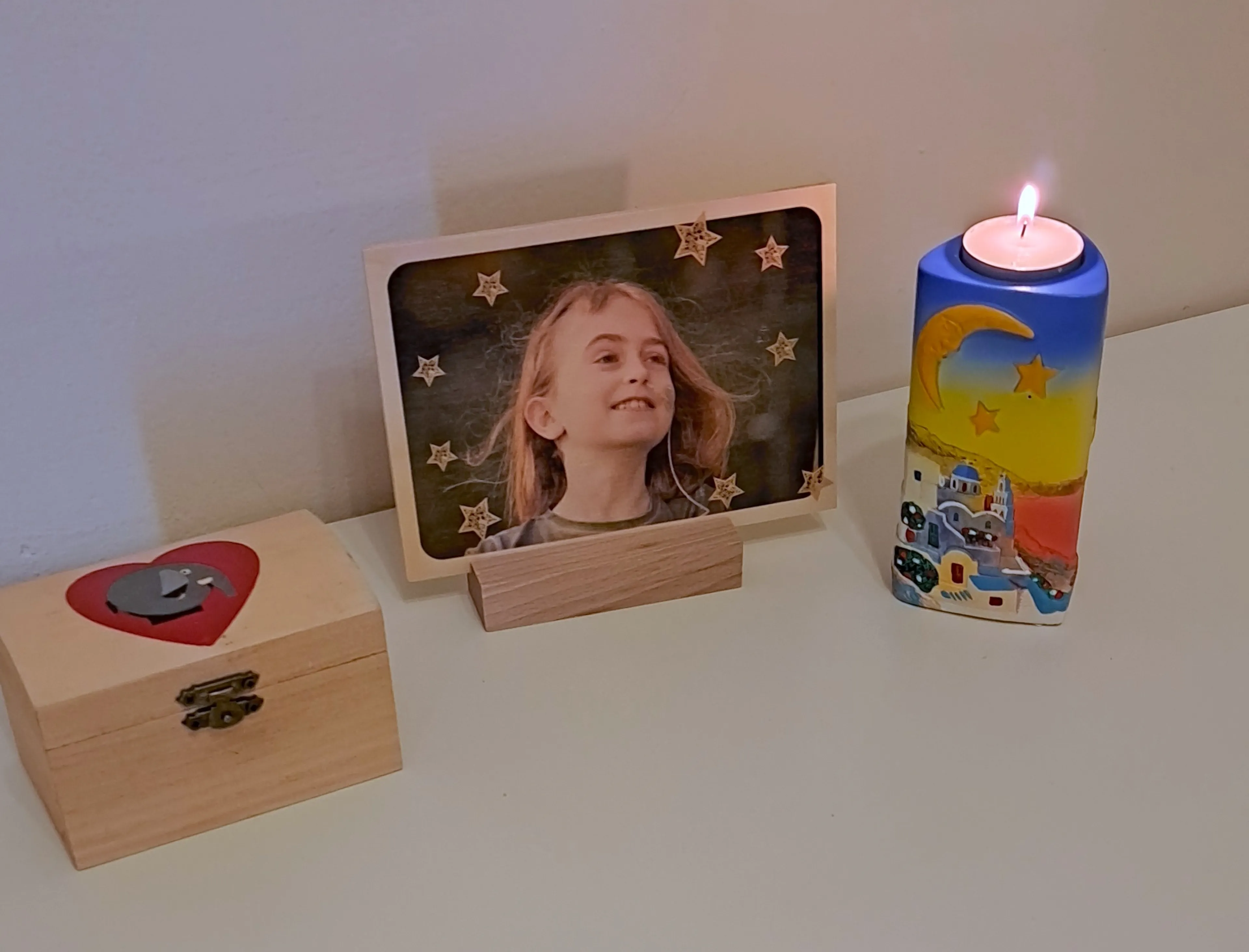Voor de eerste reis die we maakten na Luna’s overlijden in 2017, lieten we een houten kaart bedrukken met haar foto. Omdat we thuis 24/7 een waxinelichtje branden bij Luna haar foto, kan dit op vakantie natuurlijk niet ontbreken.