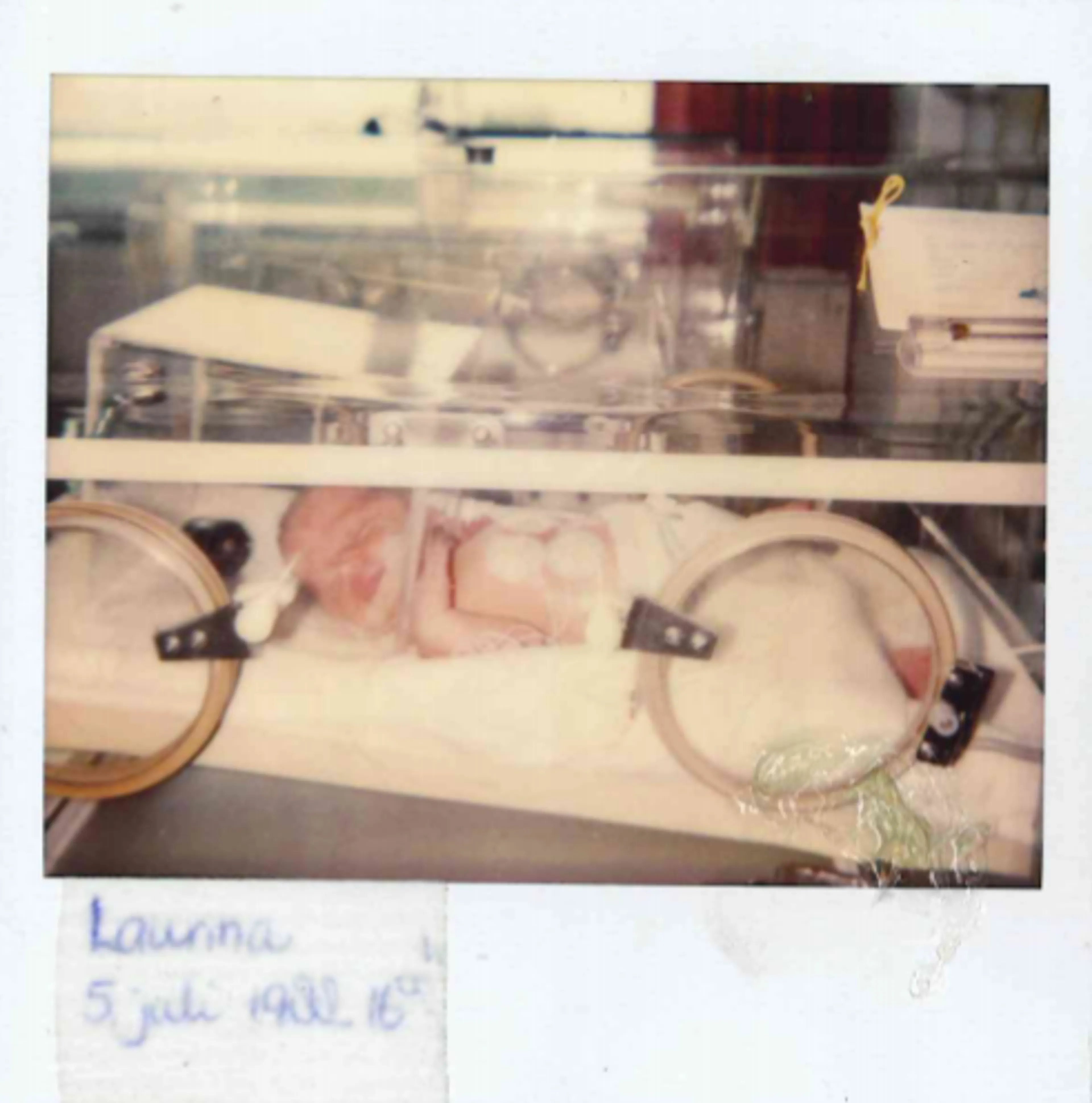 Het is 3 juli 1988. De bevalling begint, maar de placenta ligt ervoor waardoor de baby er niet via de natuurlijk weg uit kan. Via de keizersnede wordt er een meisje geboren, Laurina de Visser. Doordat er thuis waterpokken heerst mag moeder wel naar huis en blijf ik een week alleen in het ziekenhuis.