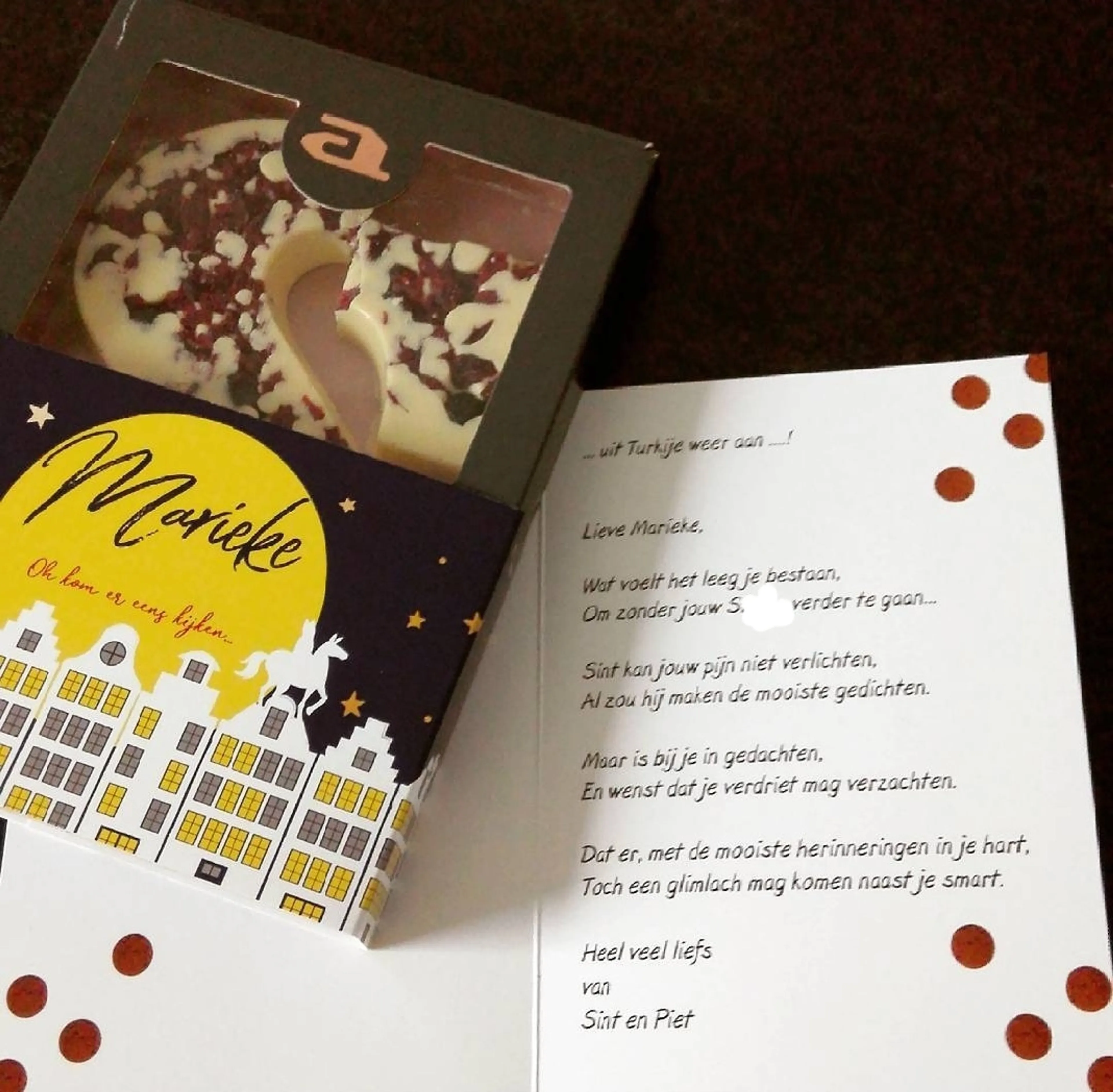 “Lieve Marieke, Wat voelt het leeg je bestaan, om zonder jouw S. verder te gaan. Sint kan jouw pijn niet verlichten, al zou hij maken de mooiste gedichten. Maar Sint is bij je in gedachten, en wenst dat je verdriet mag verzachten. Dat er, met de mooiste herinneringen in je hart, toch een glimlach mag komen naast je smart. Heel veel liefs, Sint en Piet”.