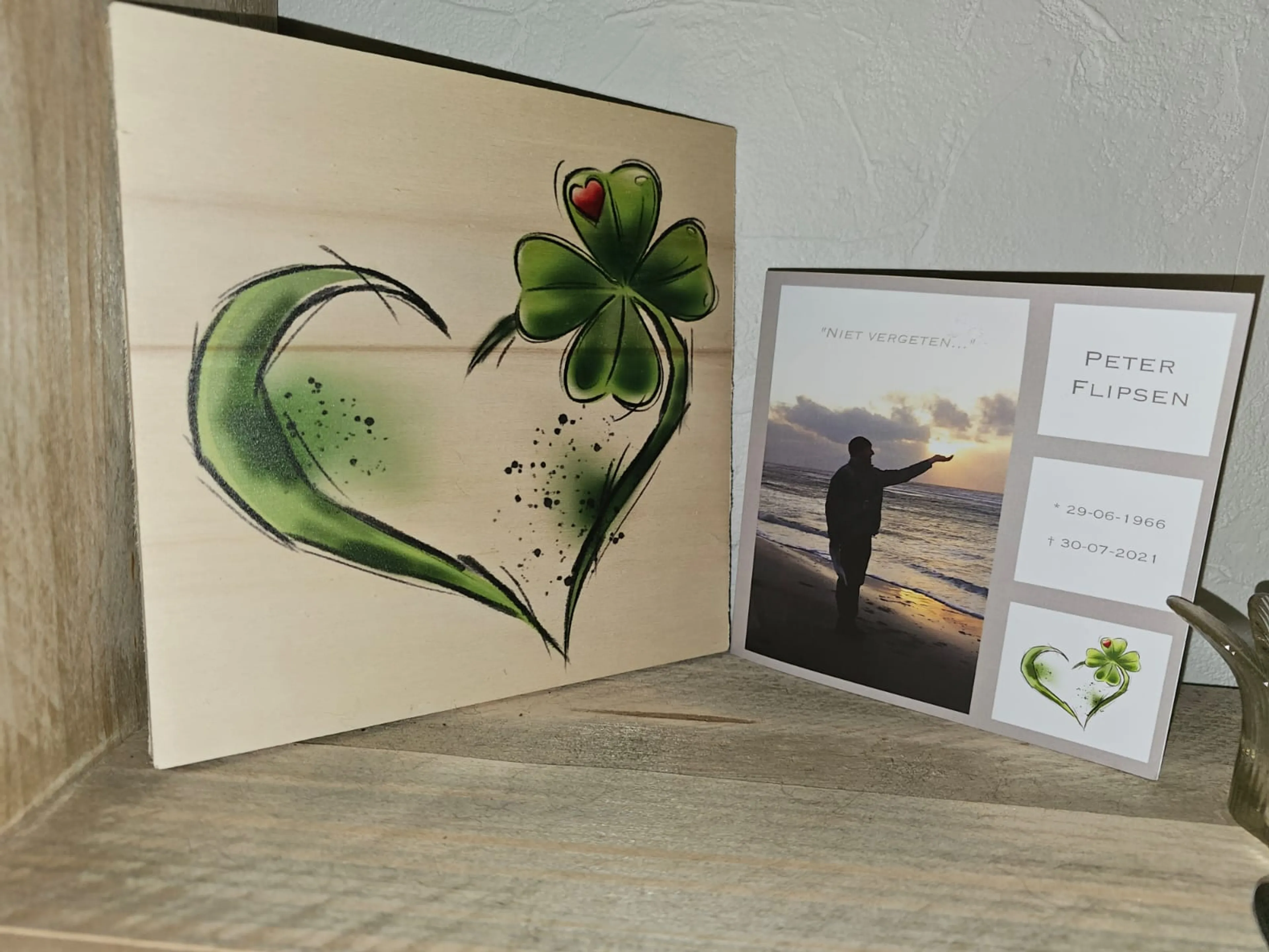 Nu, bijna twee jaar na zijn dood, begint de zoektocht naar een geschikte boomstam. Een nichtje van Peter helpt mij daarbij. Haar man is nogal handig en bood aan de urn te maken. En deze wordt precies zoals Peter wilde; een uitgeholde boomstam, inclusief raampje en gordijntjes.