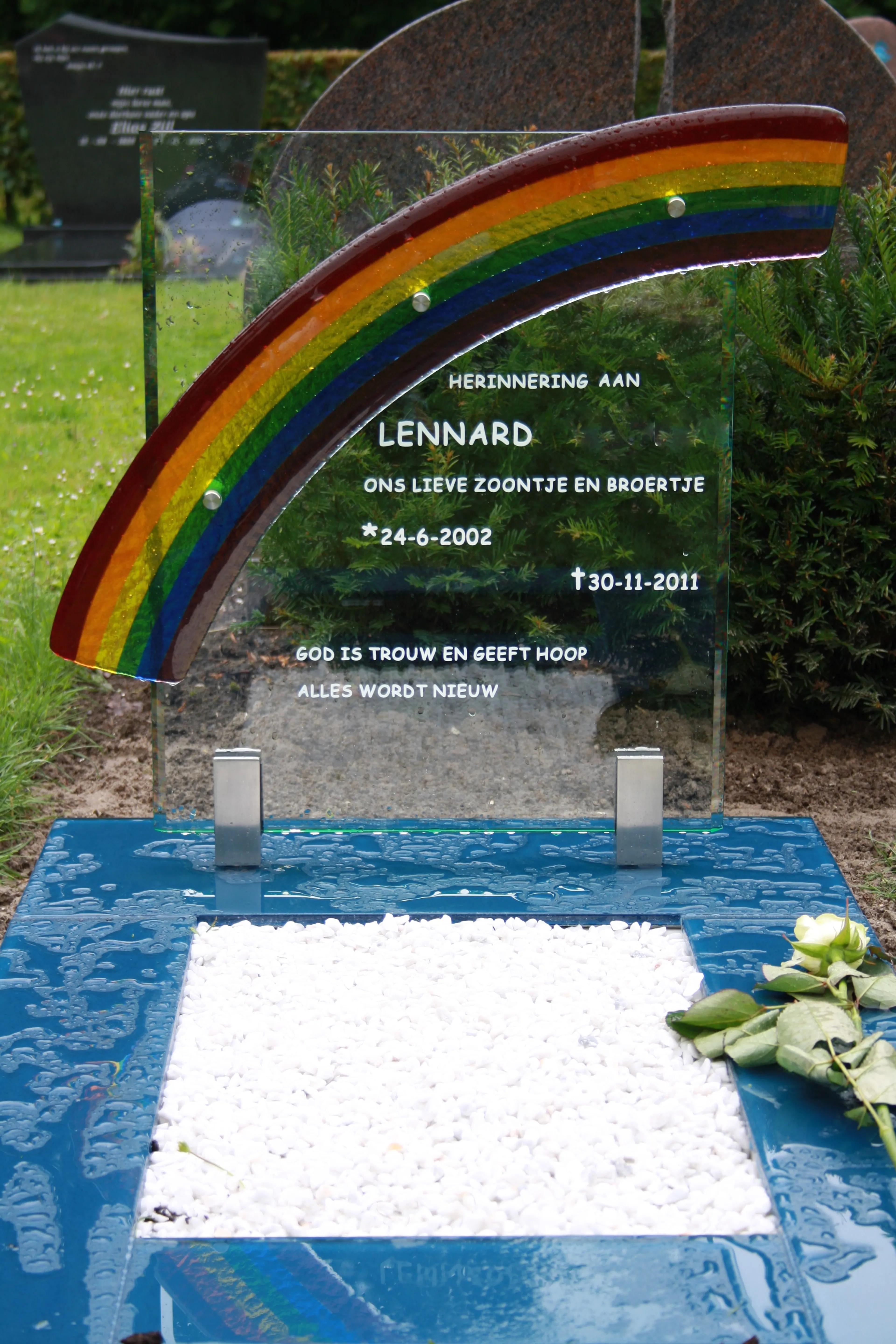 Als ik me omdraai, zie ik een kleine honderd meter verderop het grafje van Lennard liggen. En dan houd ik het niet meer. Er is niemand op de begraafplaats en ik huil. Ik loop van het graf van mijn nog maar pas geleden begraven Lautje, naar het andere graf, waar zes jaar eerder mijn lieve Lennard begraven werd. Het verdriet komt omhoog en ik huil hardop: Mijn God! Hoe kan dit? Hoe moet ik dit ooit gaan doen? Twee van mijn kinderen… Ik kan het niet begrijpen! Het doet zo veel pijn!