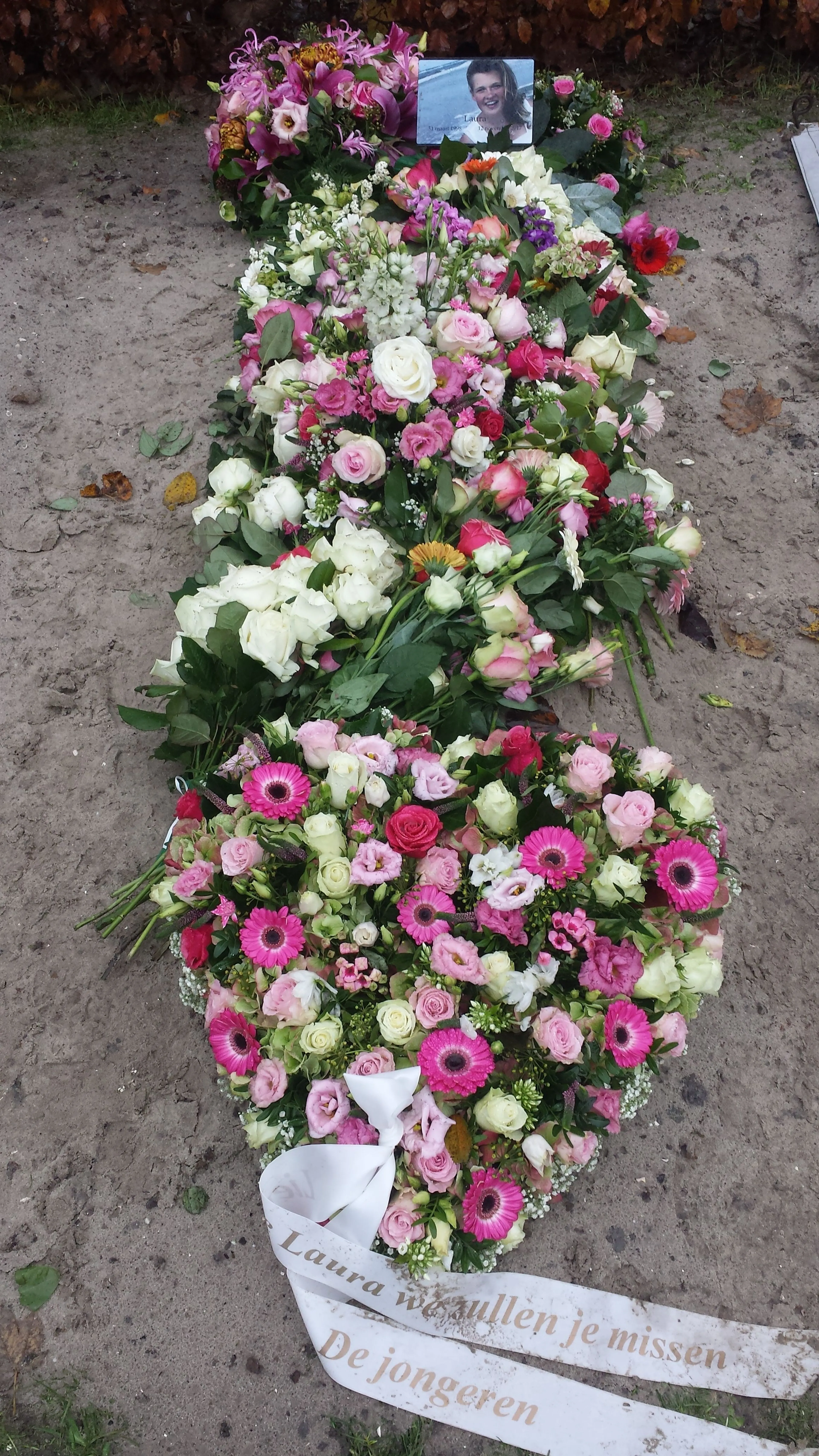 Het graf van Laura is bedolven onder een enorme bloemenzee. Bijna allemaal in roze, rood en wit. Als het niet zo verdrietig was zou het mooi zijn. Ik schik de bloemen zoals ik wil dat ze daar liggen en van een afstandje kijk ik er naar.