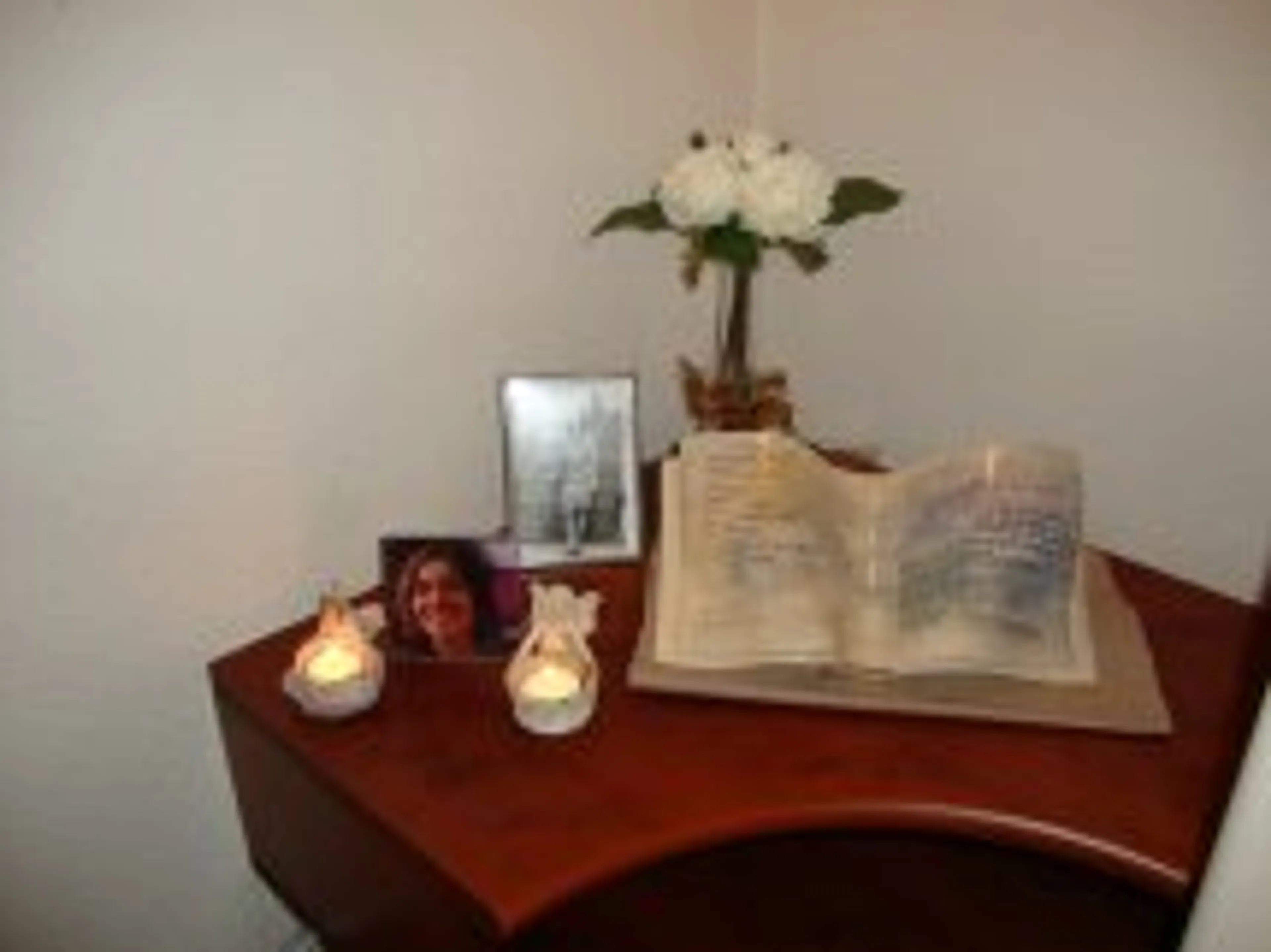 We hebben in jouw gedenkhoekje een klein huismonumentje laten maken door een kunstenares. Een ‘boekje’ van keramiek. Daarop hebben we alle vier iets geschreven.
