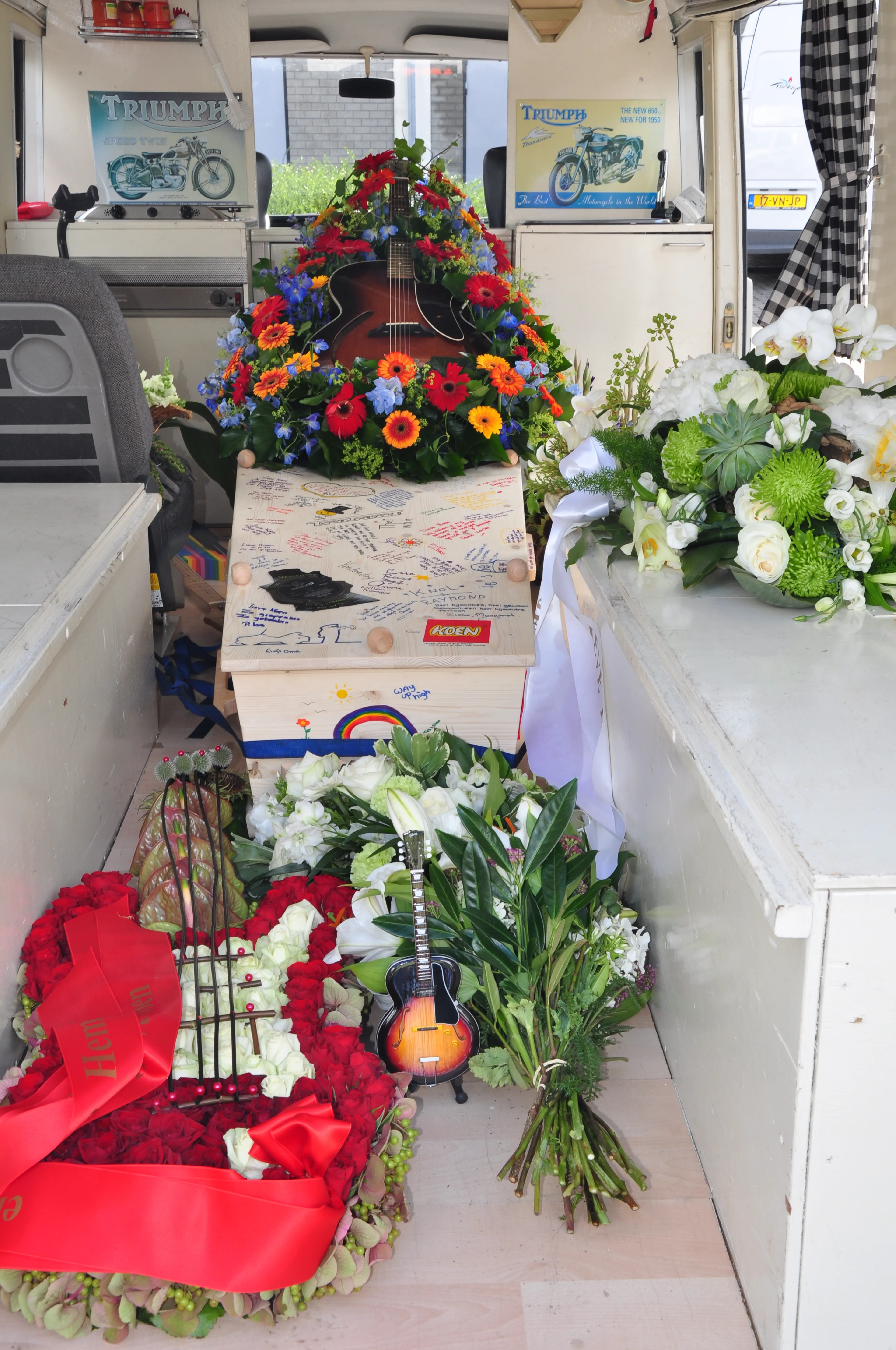 In plaats van in een traditionele rouwauto, wordt de kist vervoerd in de eigen camperbus van het gezin. “Ik nam de uitvaartbegeleider mee naar Koens kamer, zodat zij een indruk kreeg van wat voor jongen het was. Ze had zelf ook twee jongens van dezelfde leeftijd.”
