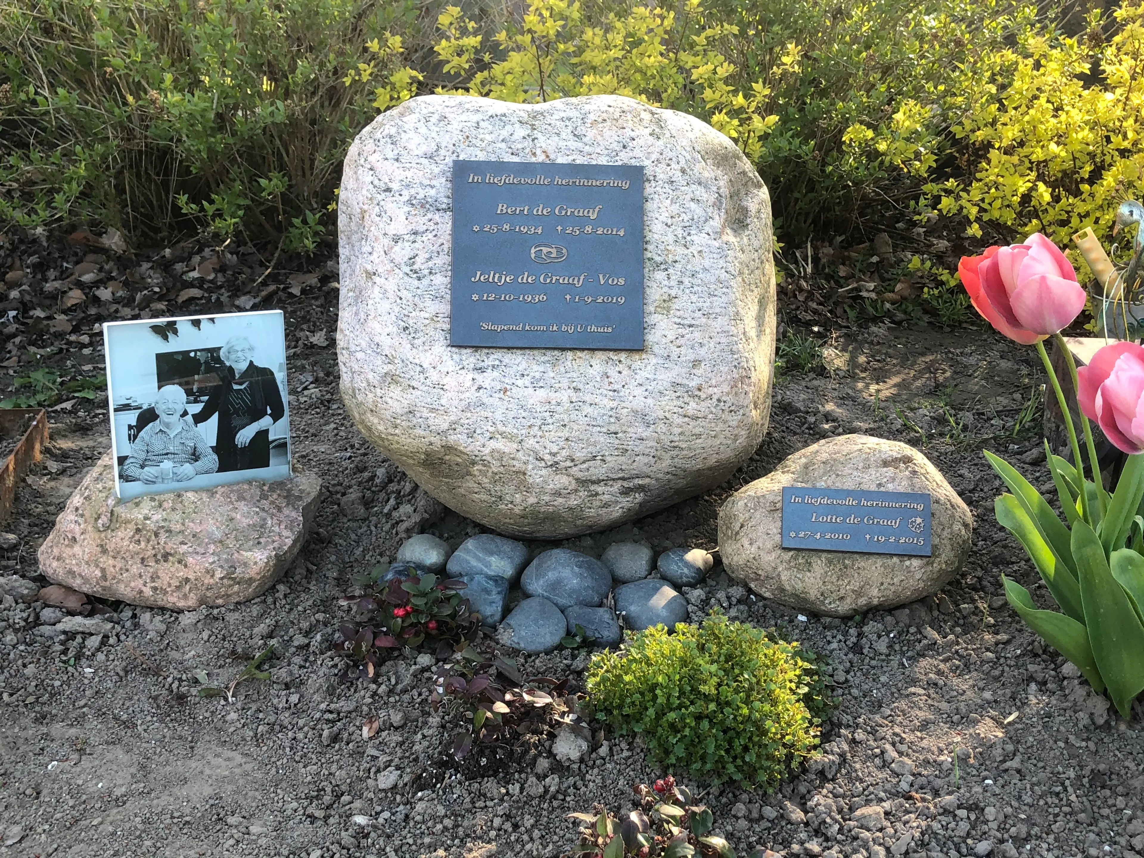 Op moeilijke dagen, zoals haar verjaardag en sterfdag, steekt Evert-Jan vaak een digitaal kaarsje voor zijn dochter aan, op de website van Ik mis je. ‘Dan heb je toch iets tastbaars om naar toe te gaan.’ Ook bezoekt hij op die dagen haar graf of dat van zijn vader en moeder, waar ook een steentje voor Lotte ligt.