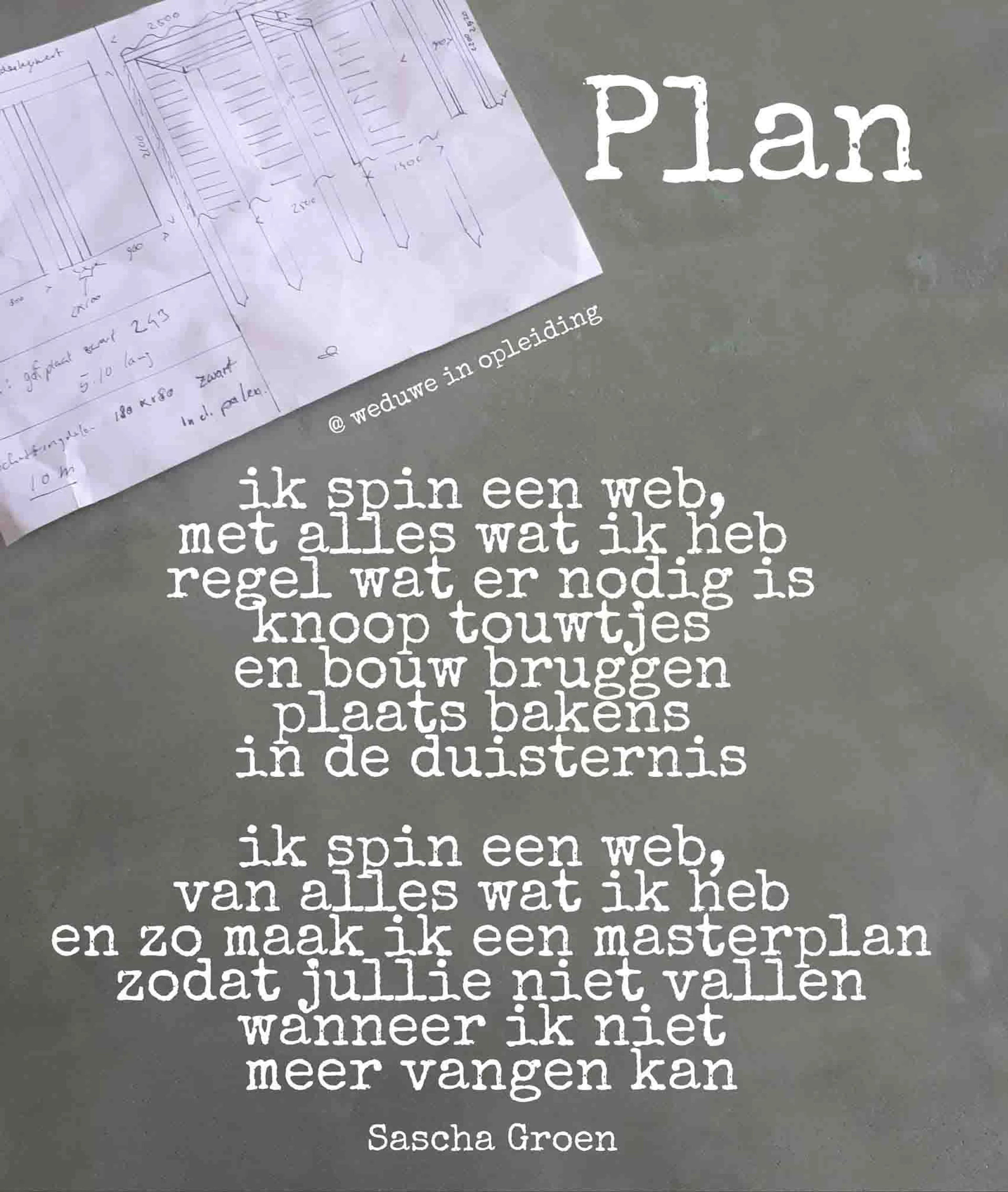 Sascha Groen (1984) hoort op haar 33ste dat haar man ongeneeslijk ziek is. Ze schrijft sindsdien onder de naam ‘Weduwe in opleiding.’ Haar missie is het bespreekbaar maken van rouw en het zorgen voor eerlijke en passende informatie voor kinderen.