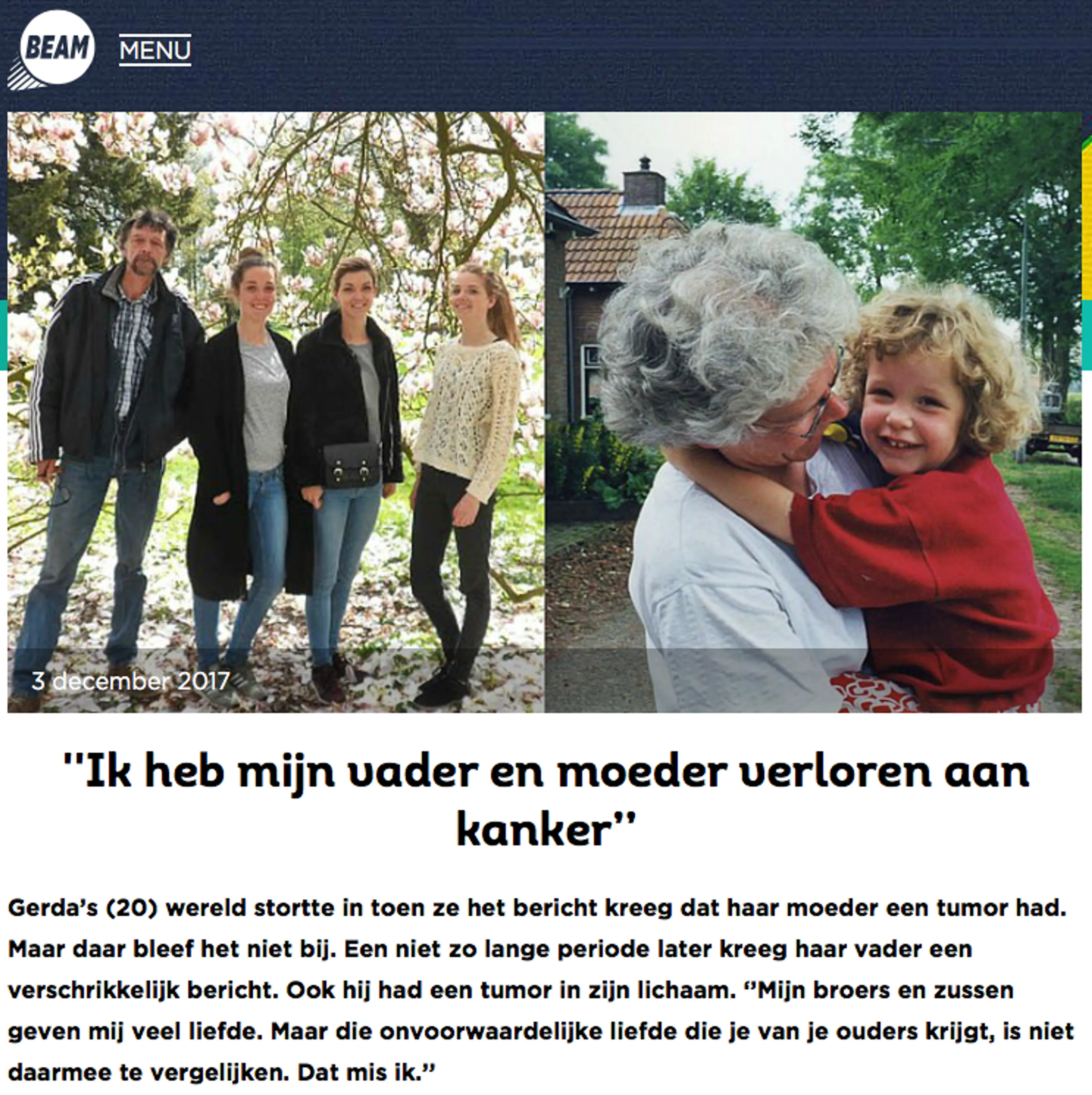 Gerda’s (20) wereld stortte in toen ze het bericht kreeg dat haar moeder een tumor had. Maar daar bleef het niet bij. Haar vader kreeg kort daarna een verschrikkelijk bericht: ook hij had een tumor in zijn lichaam. Kort na elkaar verloor Gerda zowel haar vader als haar moeder. “De onvoorwaardelijke liefde die je van je ouders krijgt, dat mis ik.’’