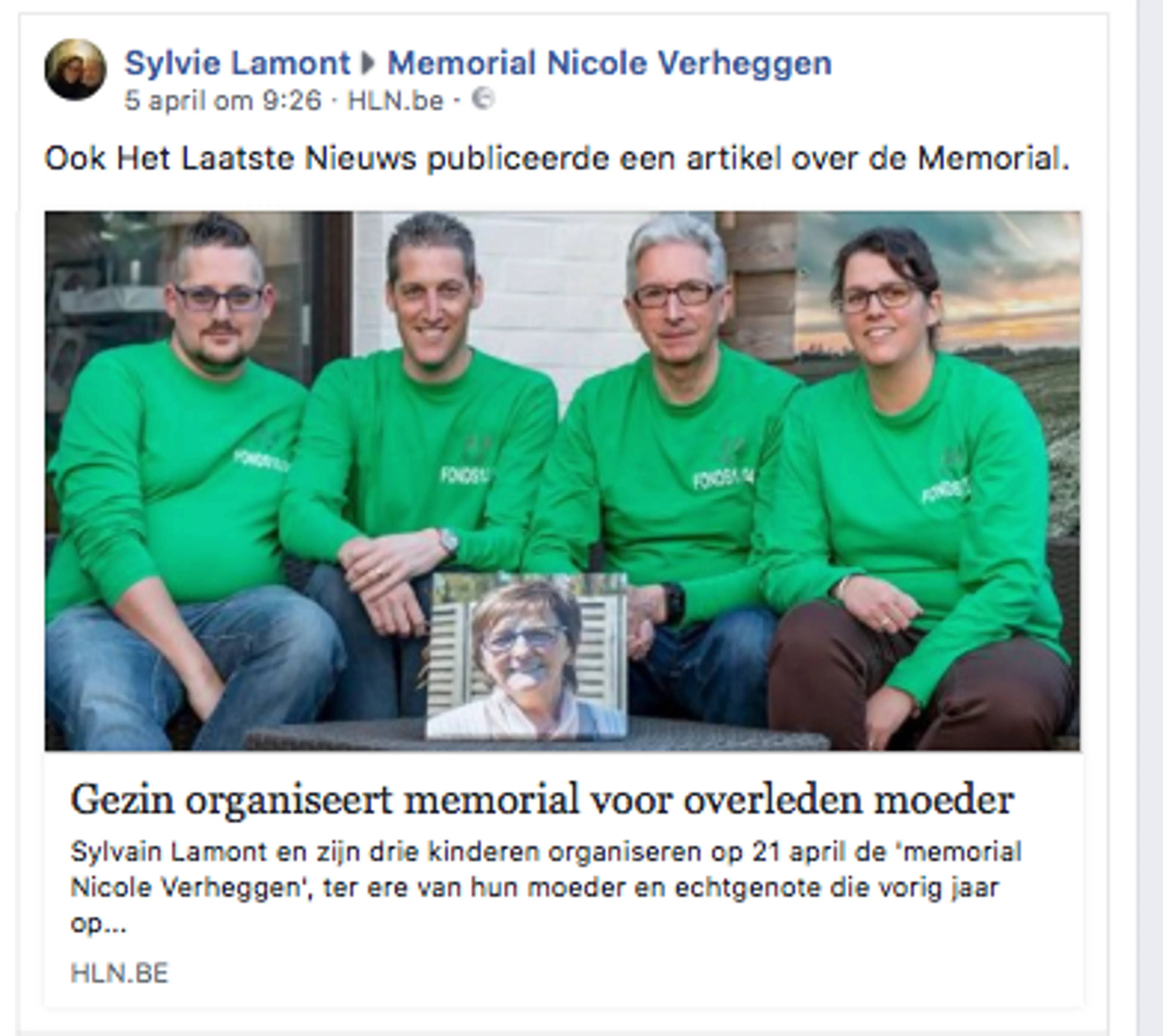 “Onze moeder Nicole was amper 61 jaar oud toen ze op 13 april vorig jaar overleed,” vertelt dochter Sylvie Lamont aan de Vlaamse krant Het laatste nieuws. “Ze sukkelde al even met haar gezondheid, maar de klap kwam daarom niet minder hard aan. Om dit uiterst negatieve gevoel van het veel te vroege overlijden om te zetten in iets positiefs, stelde ik voor om een wandeltocht te organiseren.”