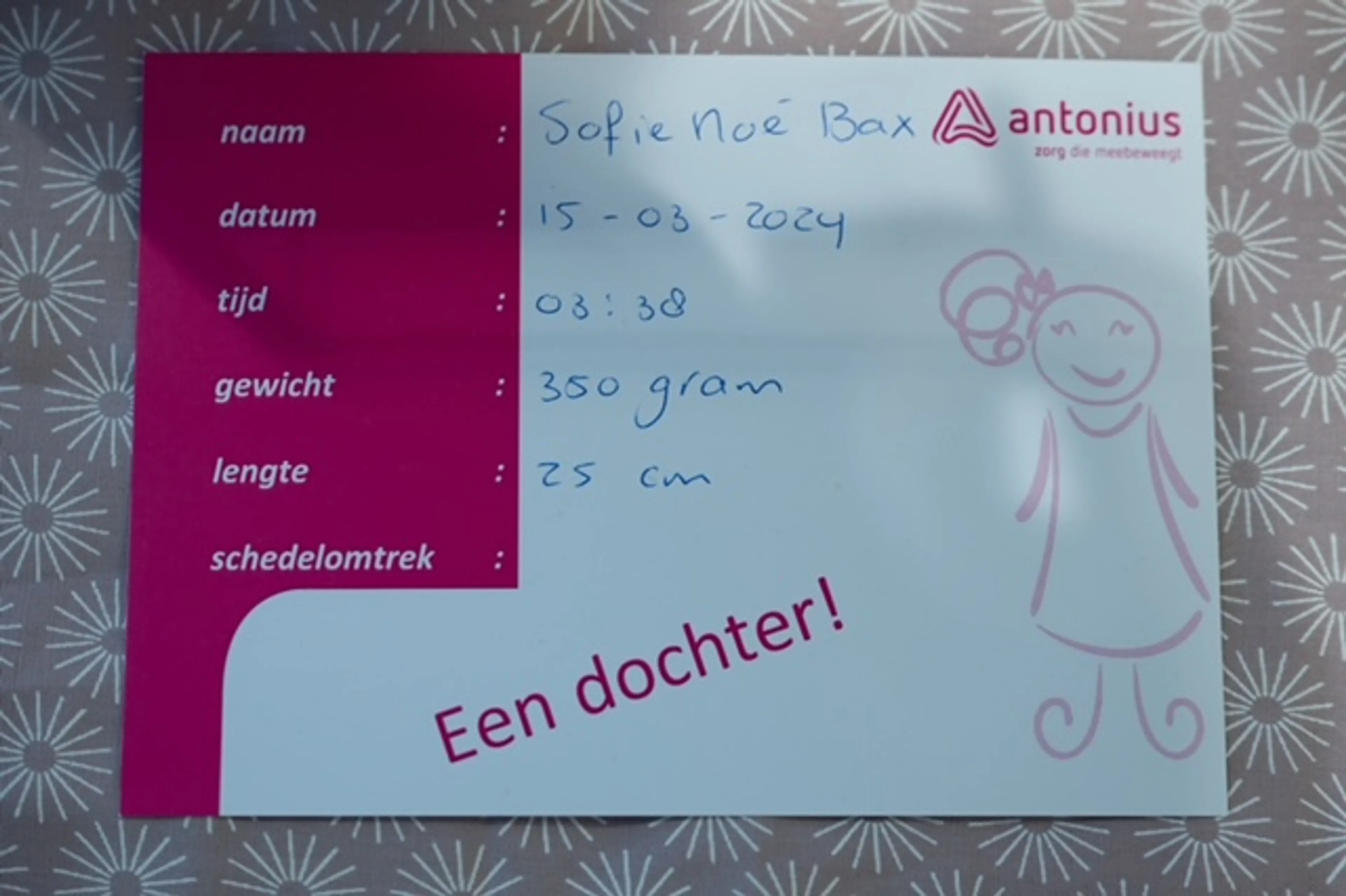 Samen met de familie namen de gebroken ouders afscheid van de kleine Sofie. “We hebben echt de tijd genomen voor dit moment.” Stichting Still kwam in het ziekenhuis om foto’s van Sofie te maken. “Deze foto’s zijn zo waardevol; een tastbaar bewijs van haar bestaan.” Na het uitgebreide afscheid werd Sofie gecremeerd. “Op haar geboortekaartje staat: Met liefde gedragen, uit liefde laten gaan.” Hoeveel pijn het ook doet, Iris heeft vrede met haar beslissing.