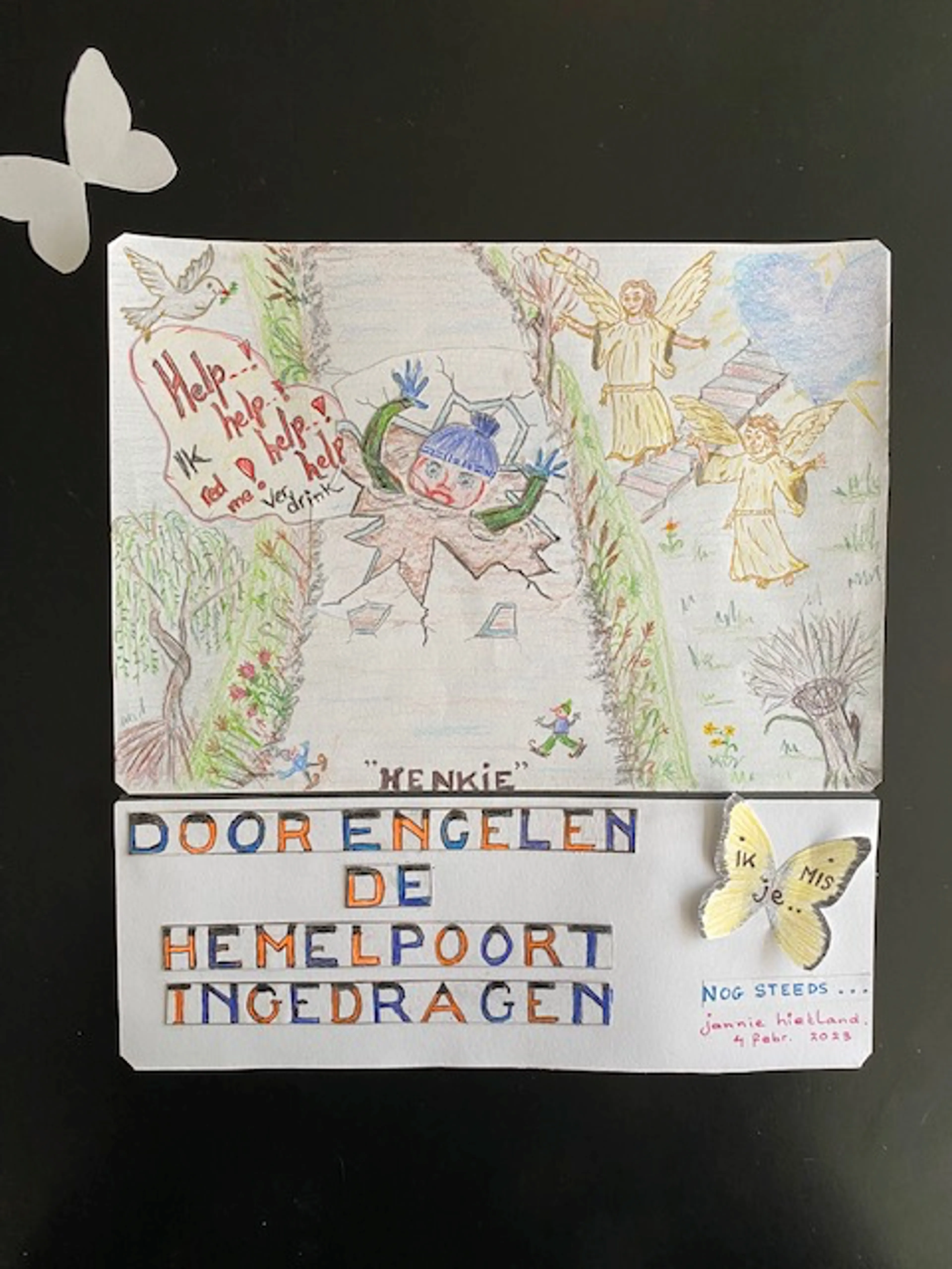 Daarnaast tekent Jannie, ook op advies van haar psycholoog. “Eerst zei ik: nee hoor, dat kan ik helemaal niet. Een zus van mij, die veel tekent, vond dat ik het gewoon moest proberen. 'Het is maar papier,' zei ze dan. Uiteindelijk gaat het er niet om dat het mooi is, het gaat erom dat de pijn en het verdriet een plek krijgen.” Ze laat een voorbeeld zien, gebaseerd op een uitspraak die een pastoraal werker jaren geleden deed: “Henkie is door engelen de hemelpoort binnengedragen.”