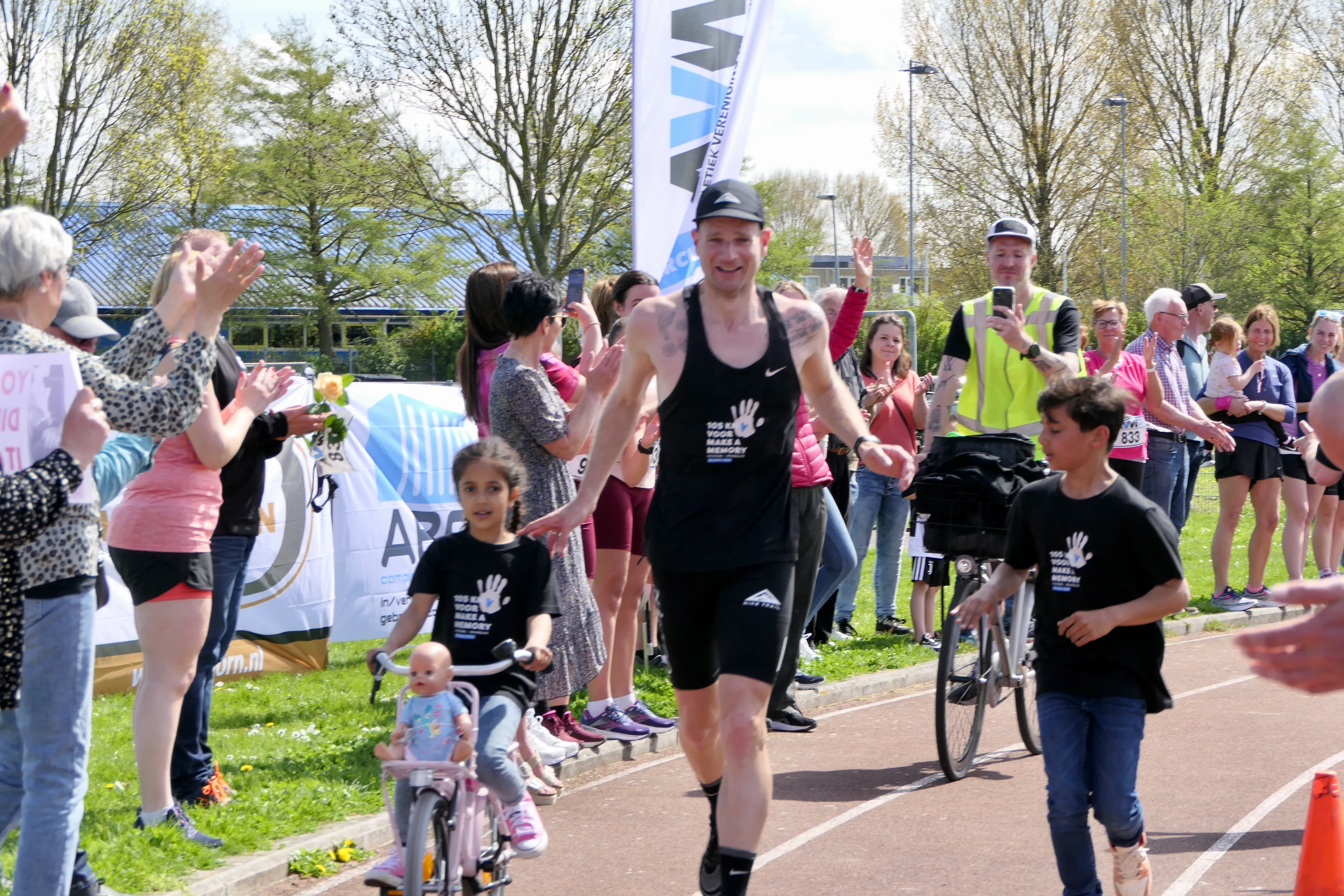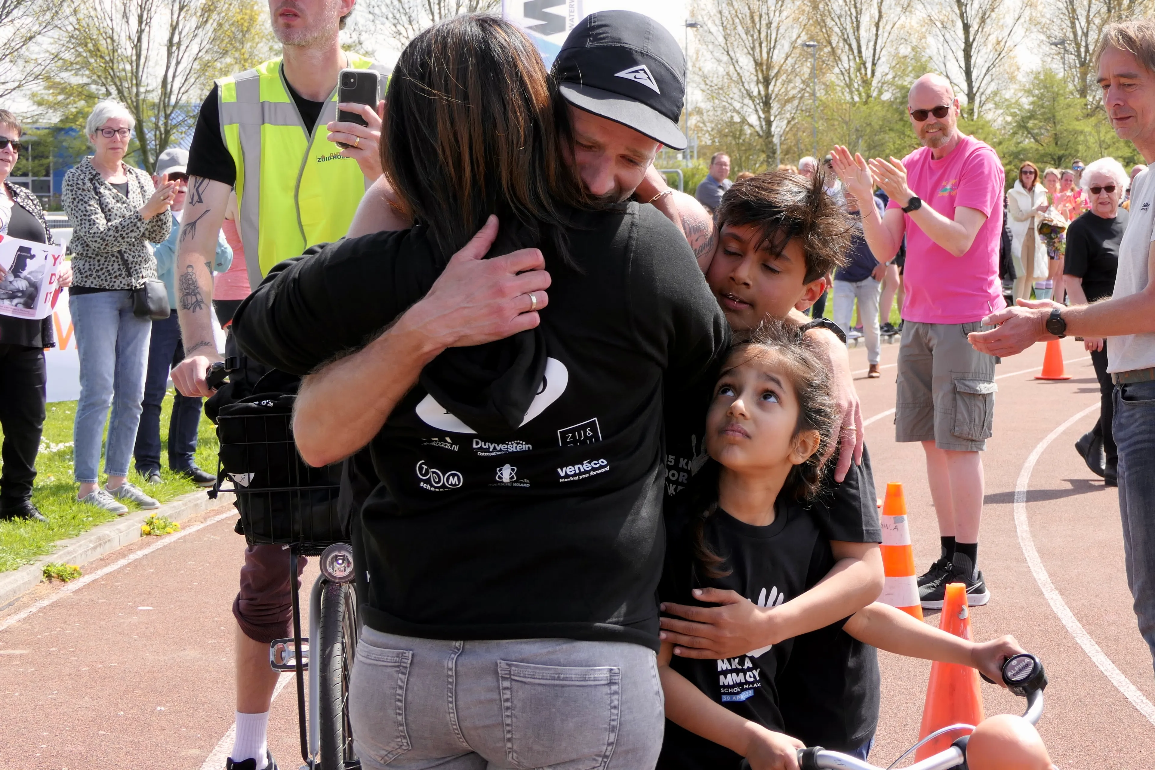 De laatste kilometer is er sowieso eentje om nooit te vergeten. “Die liep Jaden met me mee. En de laatste 500 meter fietste Esmée - met haar pop - mee. Mijn zoon zei: ‘We zijn het aan het doen hè? Het gaat lukken!’ Op de atletiekbaan stonden er zo’n tweehonderd mensen me op te wachten, mijn vrouw bij de finish. Dat was een magisch moment, waar ik nog steeds niet met droge ogen naar kan kijken.”