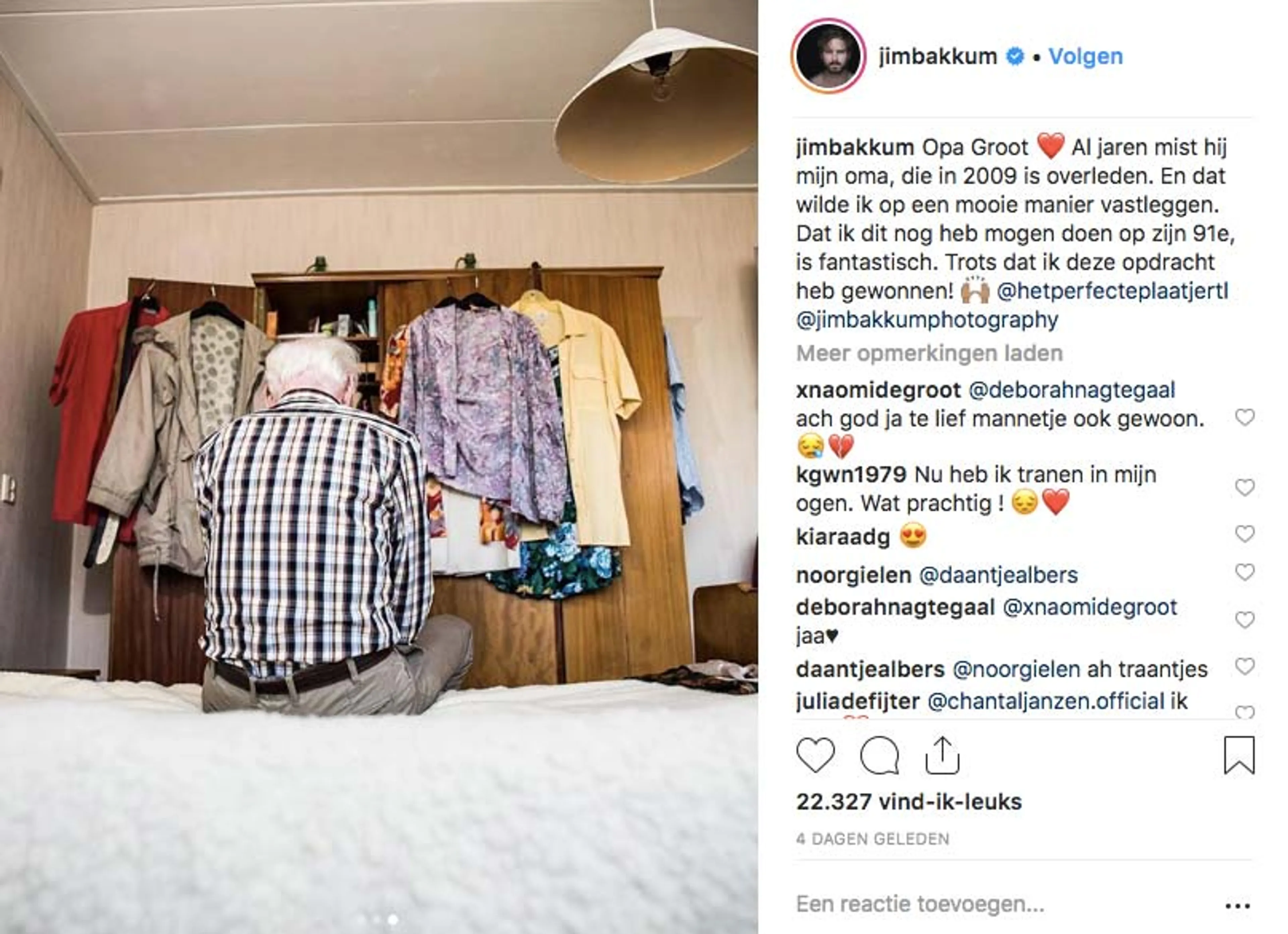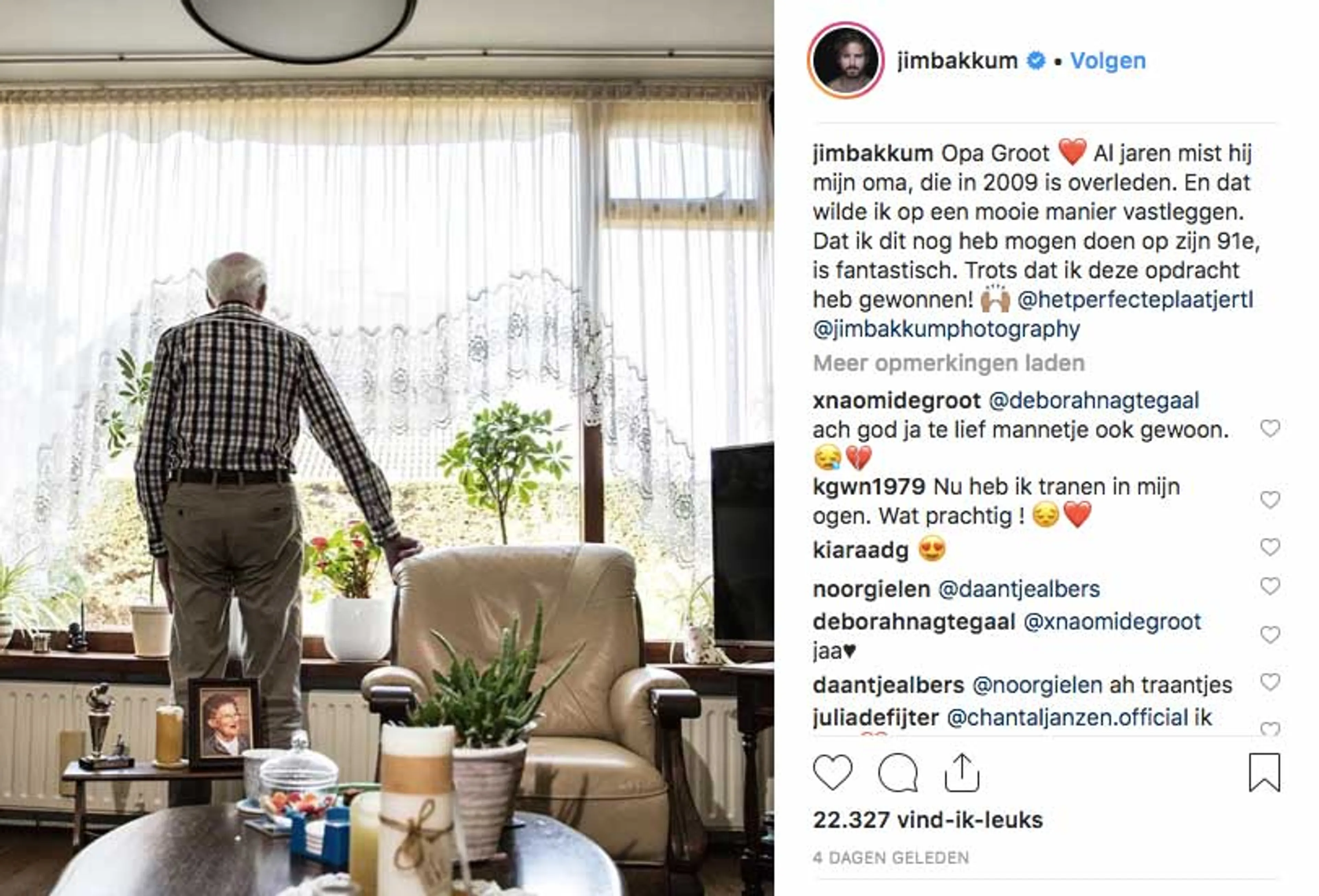 Na afloop van de uitzending wordt Jim via zijn Instagram-pagina overladen met reacties. Als dank voor alle steun post hij nog een laatste portret van Opa. Hij schrijft erbij: ‘Nooit gedacht dat ik met foto’s zoveel mensen mocht raken. Op de foto’s moesten we vastleggen wat óns raakt en dat was in dit geval de leegte van het missen van mijn oma.’