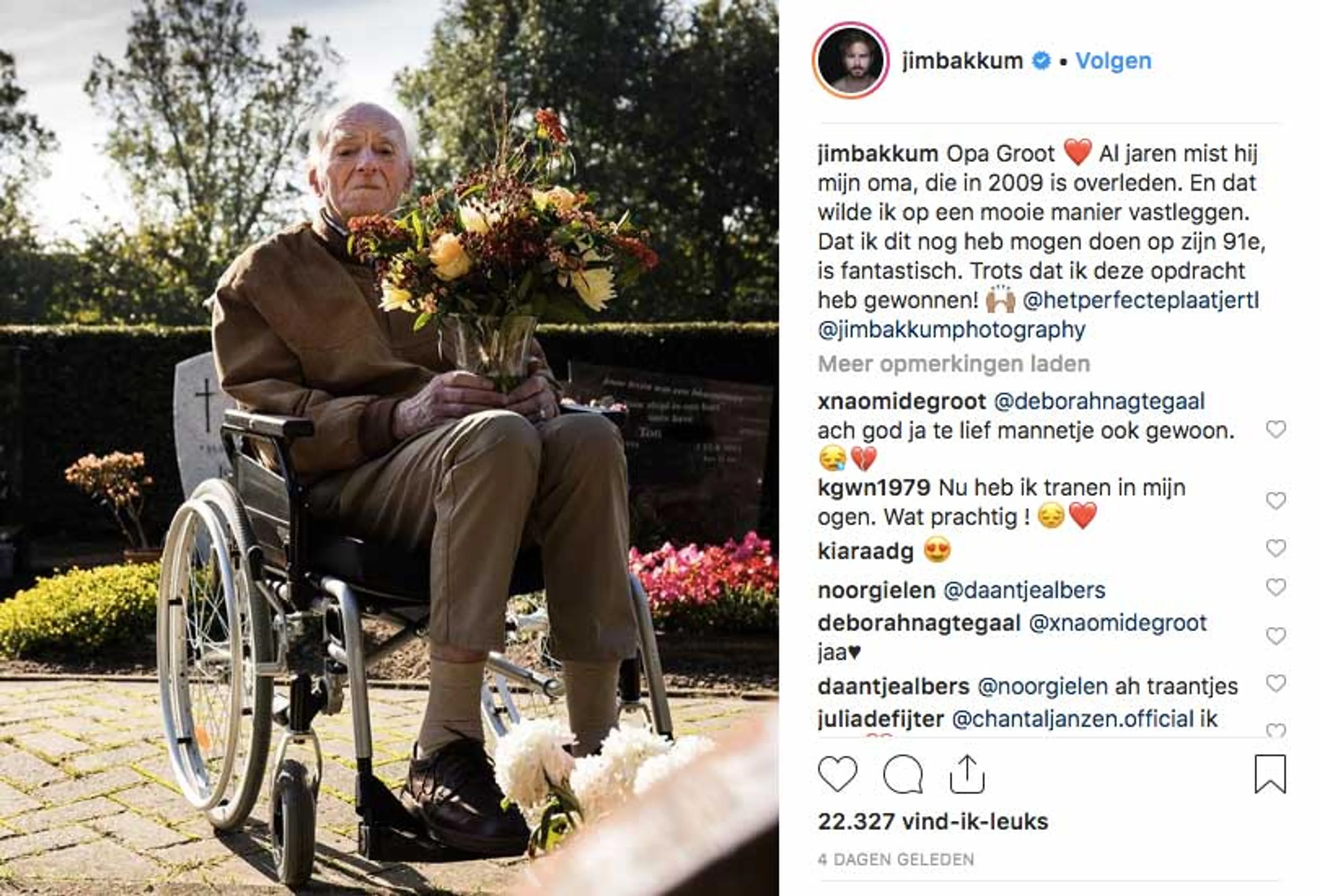 ‘We zijn naar het graf gegaan en natuurlijk bij hem thuis. Ik heb mijn opa vastgelegd met een thema dat me heel erg raakt’, vertelt Jim in een video aan de jury van het programma. Na afloop van de uitzending plaatst Jim de drie foto’s op zijn Instagram-pagina.