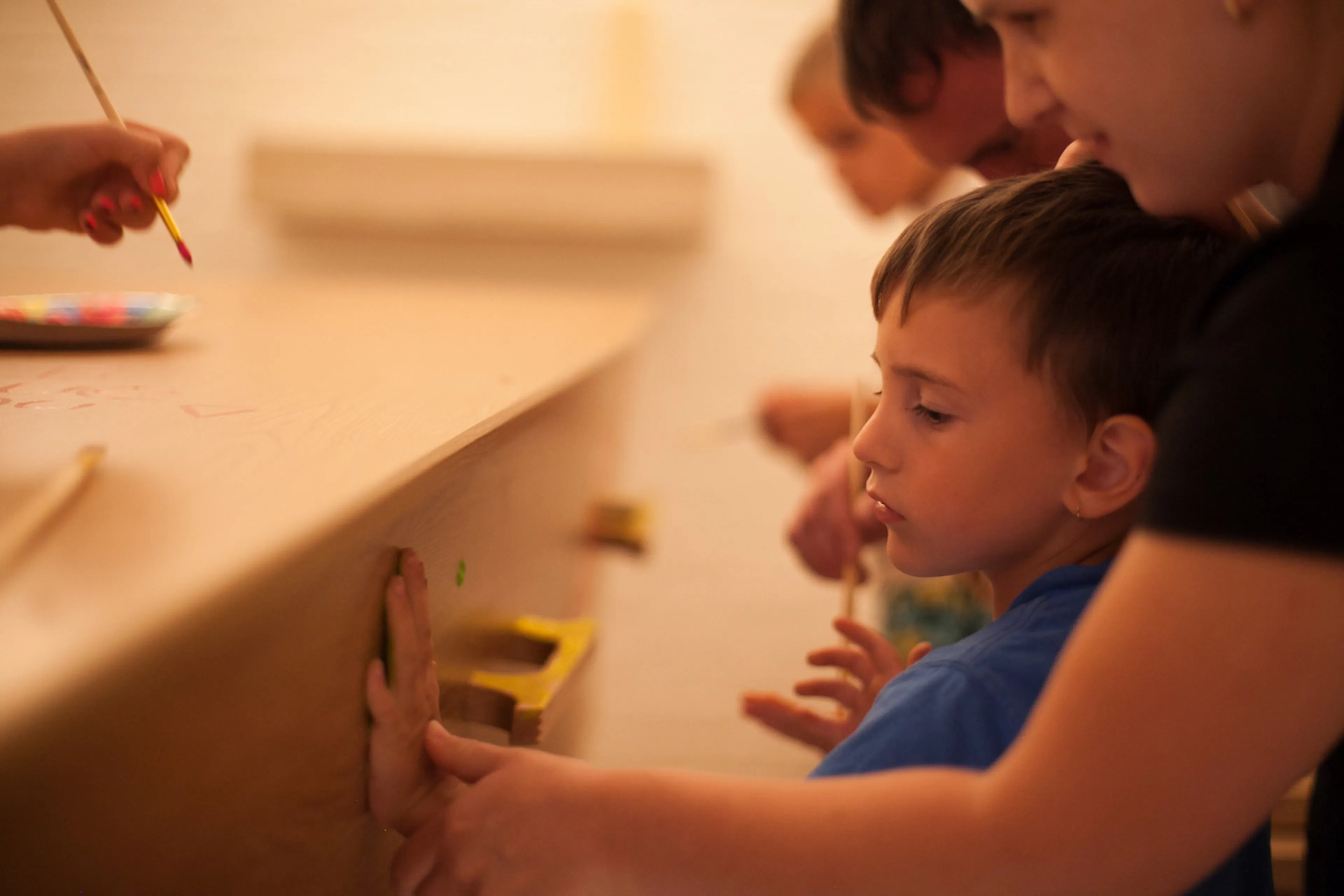 De kinderen variërend tussen de 0 en 12 jaar mochten aan de slag. Lacey, de oudste dochter, had een ontwerp van een regenboog bij zich had. De voetjes van de jongste werden bloot gemaakt om de voetzooltjes met natte verf te bedekken. Potjes met water, papieren bordjes met klodders verf en dikke en dunne kwasten werden verdeeld.