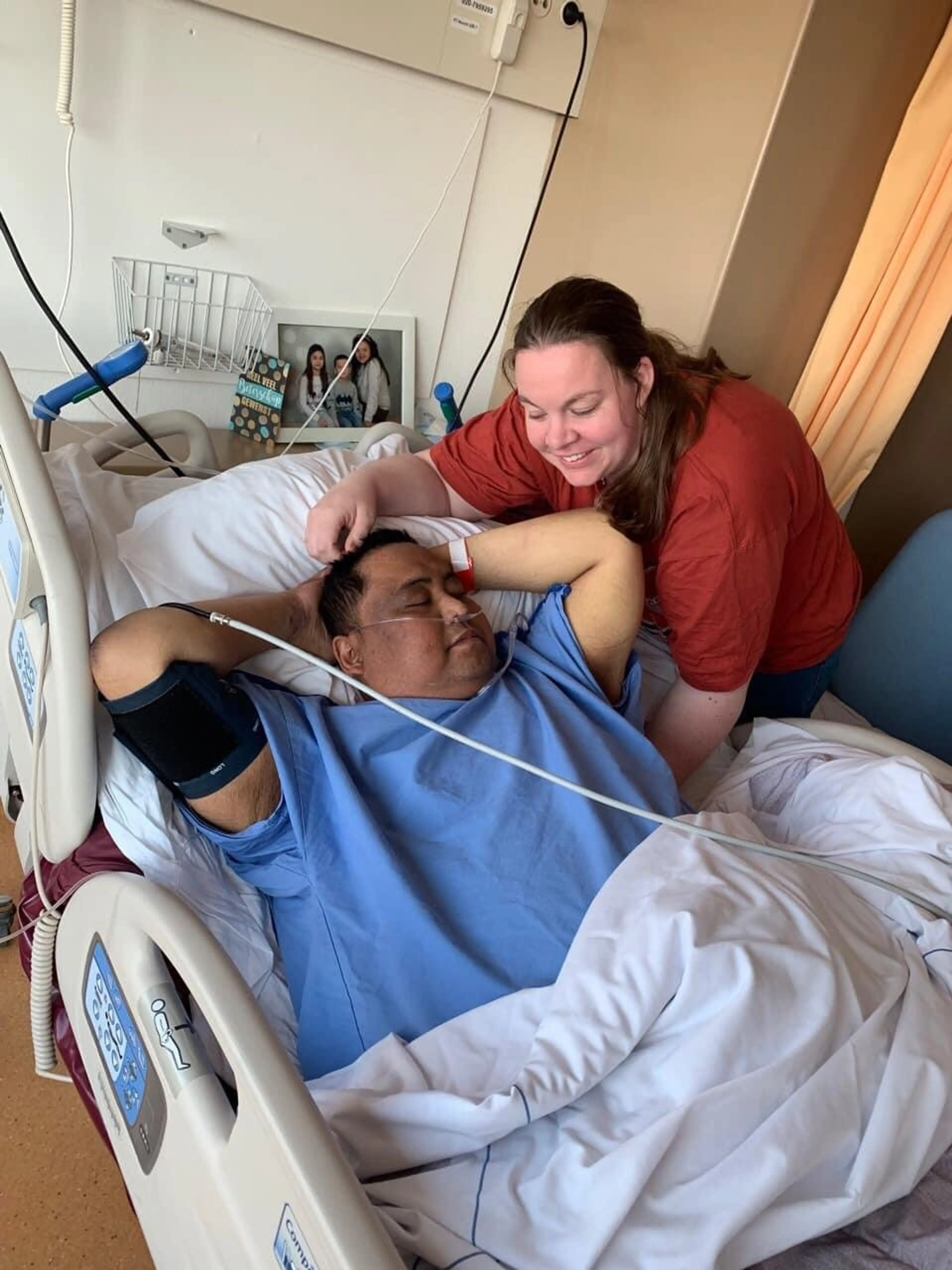 Het is onze laatste foto als gezin. Als je goed kijkt, zie je onze kinderen in het fotolijstje op de achtergrond. Ik kijk heel liefdevol naar hem. Dit is hoe hij was. Ondanks de slangetjes, spat voor mij de liefde er vanaf.’