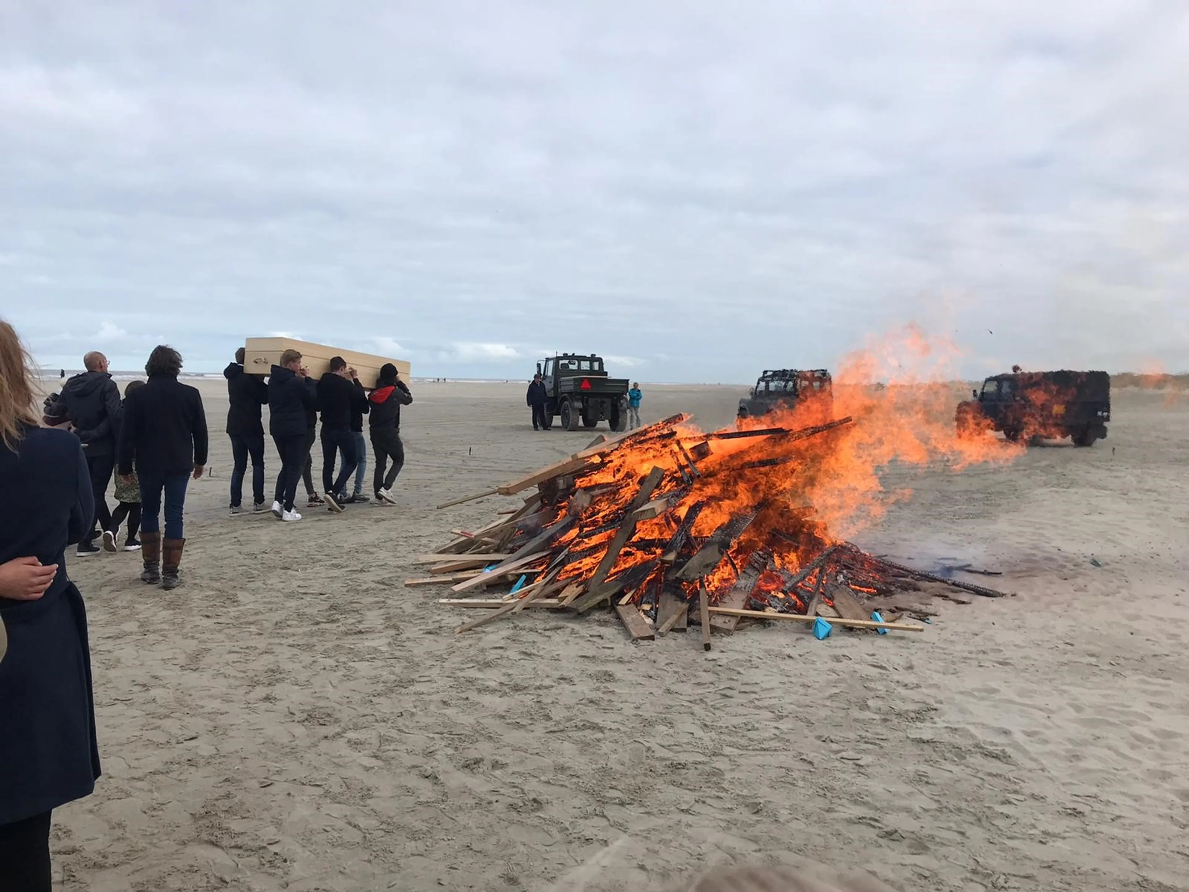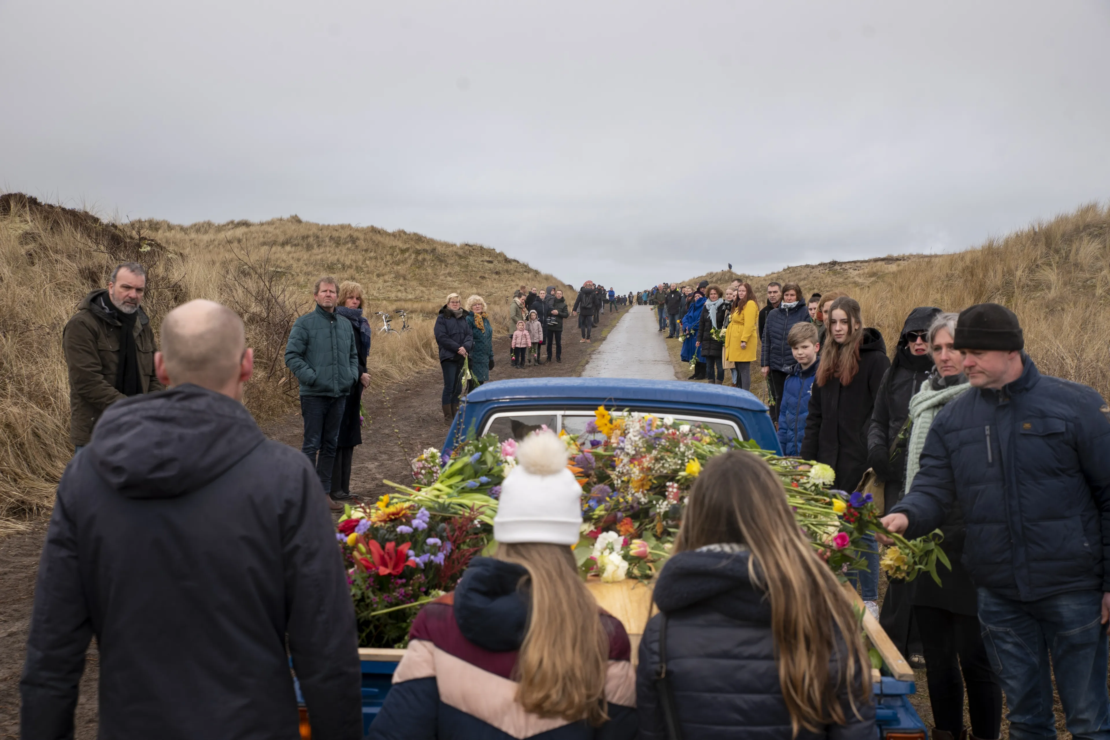 Mees’ afscheid is op het strand. Met een groot vuur en vrienden van Mees die zijn kist dragen. “Ze hadden de avond ervoor geoefend met een strijkplank,” zegt Anemoon liefdevol. Vijftienhonderd man in een erehaag en een berg aan bloemen. “Mees was van iedereen.”