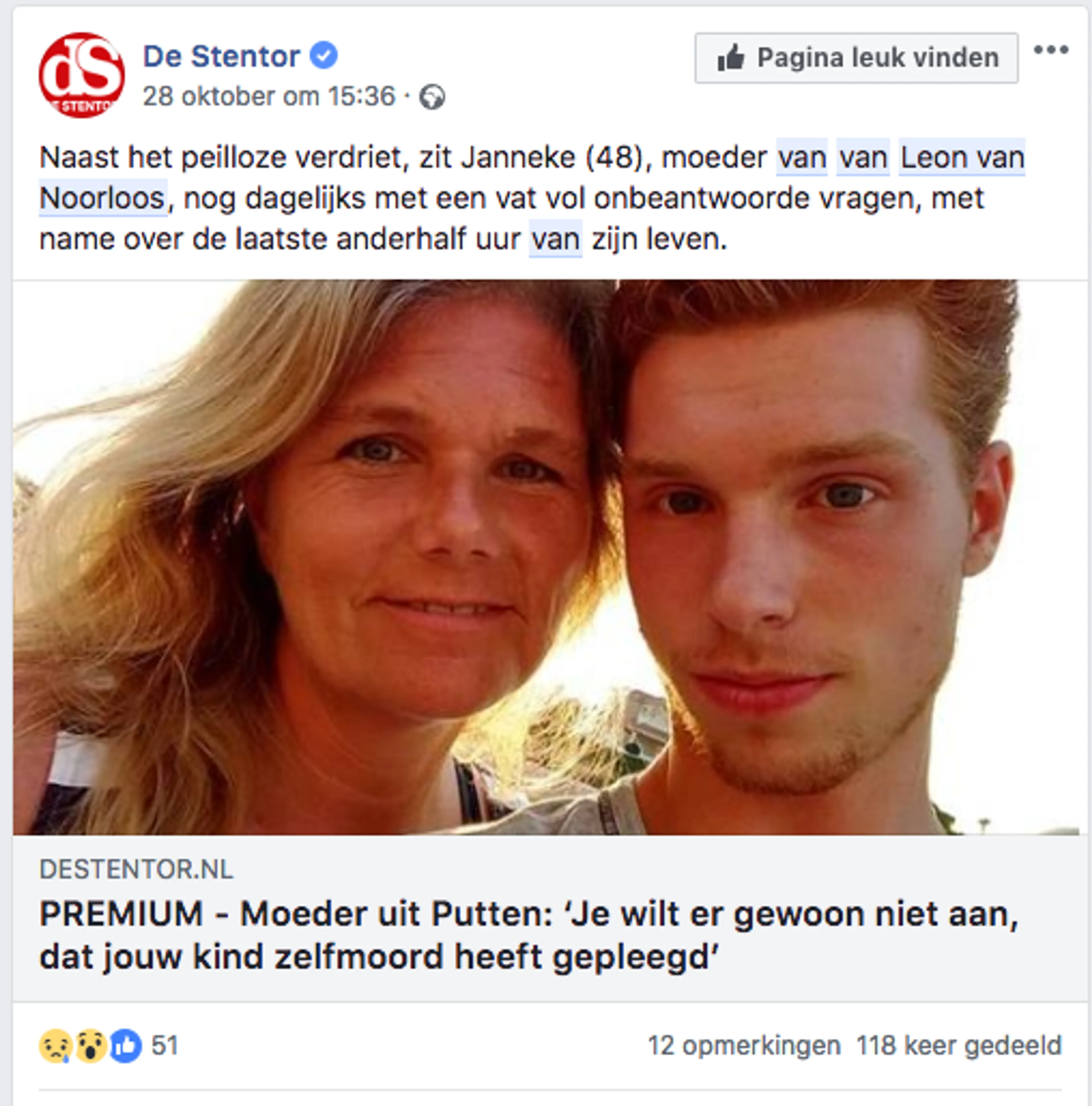 Op 22 september vorig jaar komt er een einde aan het jonge leven van Leon van Noorloos (17), zoon van Janneke(48) uit Putten. Het is voor deze moeder een groot vraagteken wat haar sportieve, sociale tiener er die dag toe brengt een einde aan zijn leven te maken. Via een ingezonden brief in de regionale krant roept ze de hulp van haar omgeving in.