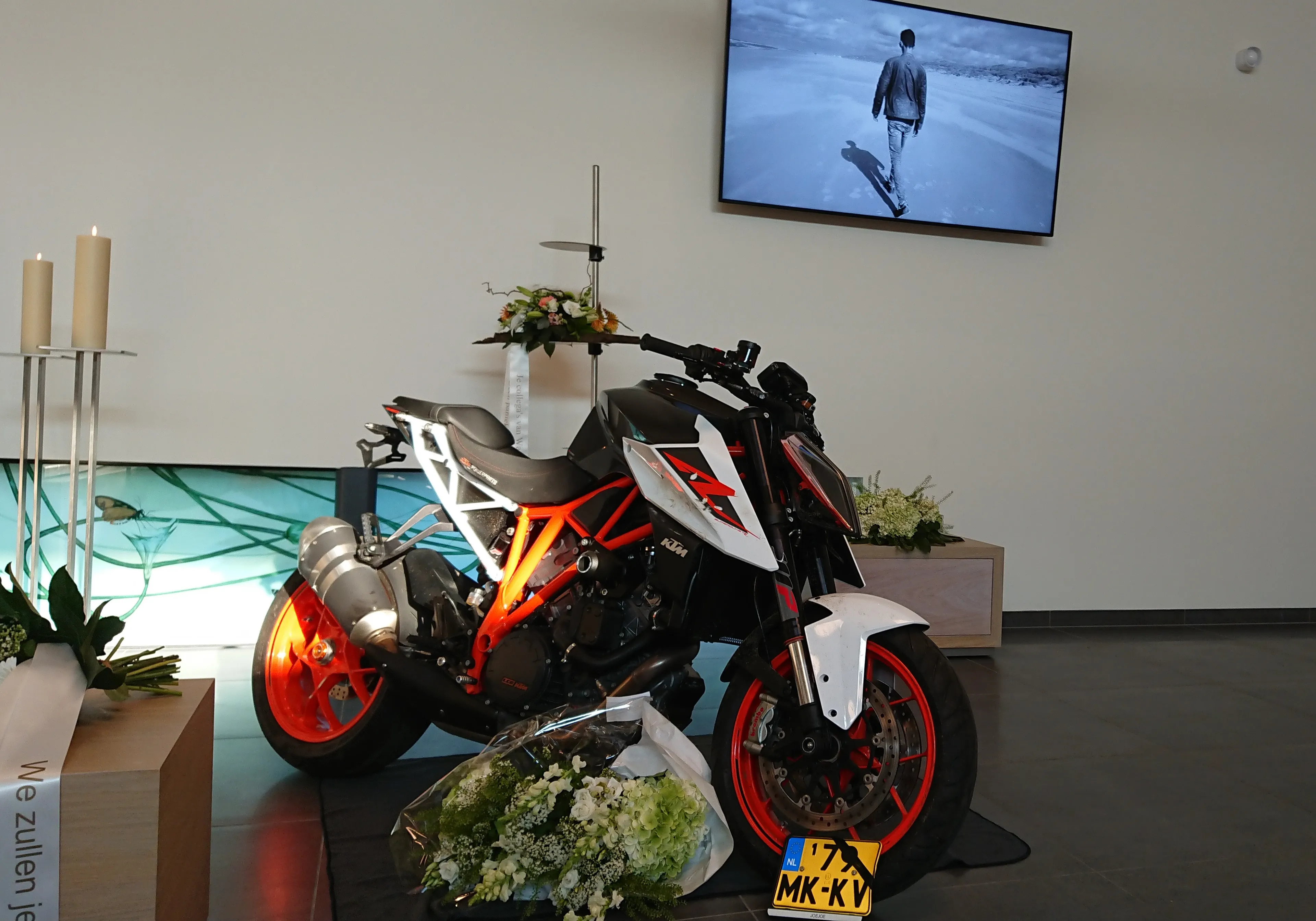 Tim ligt thuis opgebaard in de garage waar hij zo graag was. Als zijn kist naar de aula wordt gedragen waar de afscheidsdienst plaatsvindt, vormen zijn vrienden een erehaag met ronkende motoren. Willem-Jan is nog steeds onder de indruk als hij aan dat gebaar denkt. Tims motor wordt naar binnen gereden en komt naast Tims kist te staan.