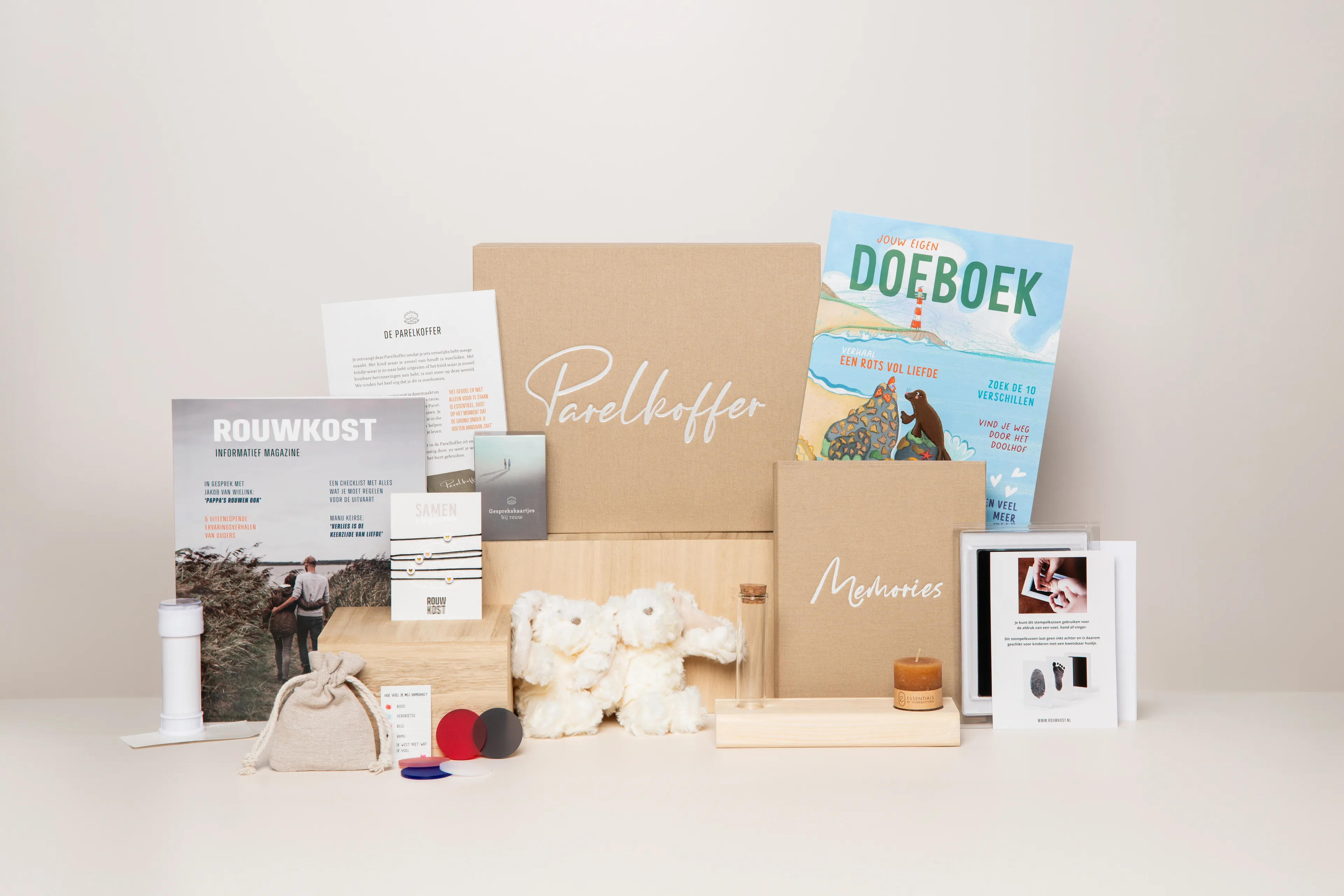 Wat er dan in de Parelkoffer te vinden is? Een informatief magazine van de stichting, met daarin artikelen van professionals of ervaringsdeskundigen die je helpen navigeren in het ruwe landschap van rouw; een invulboek waarin kostbare herinneringen genoteerd kunnen worden; een stempelsetje waarmee nog voor de uitvaart hand-, vinger- of voetafdrukjes kunnen worden gemaakt; gesprekskaartjes en meer.