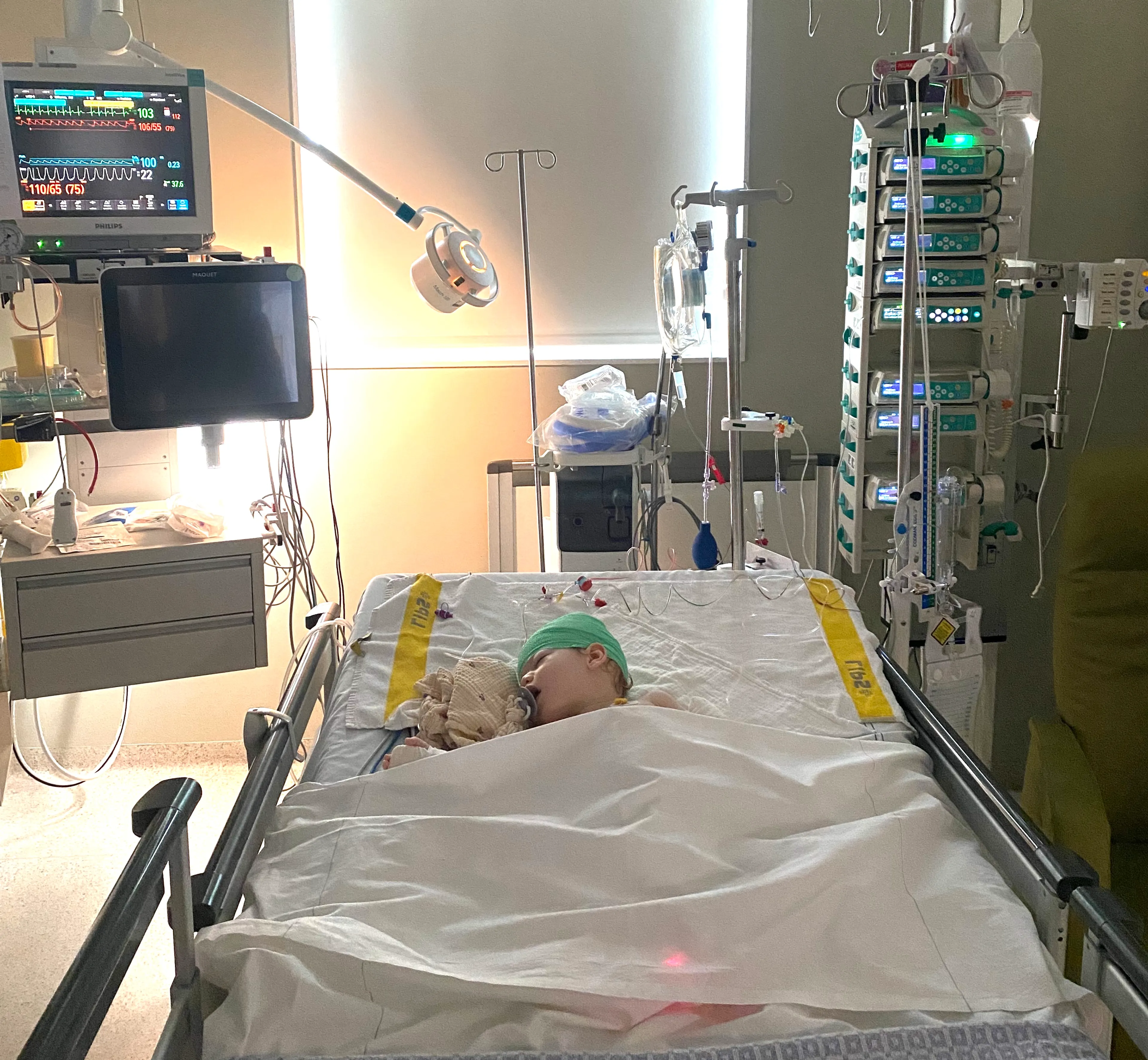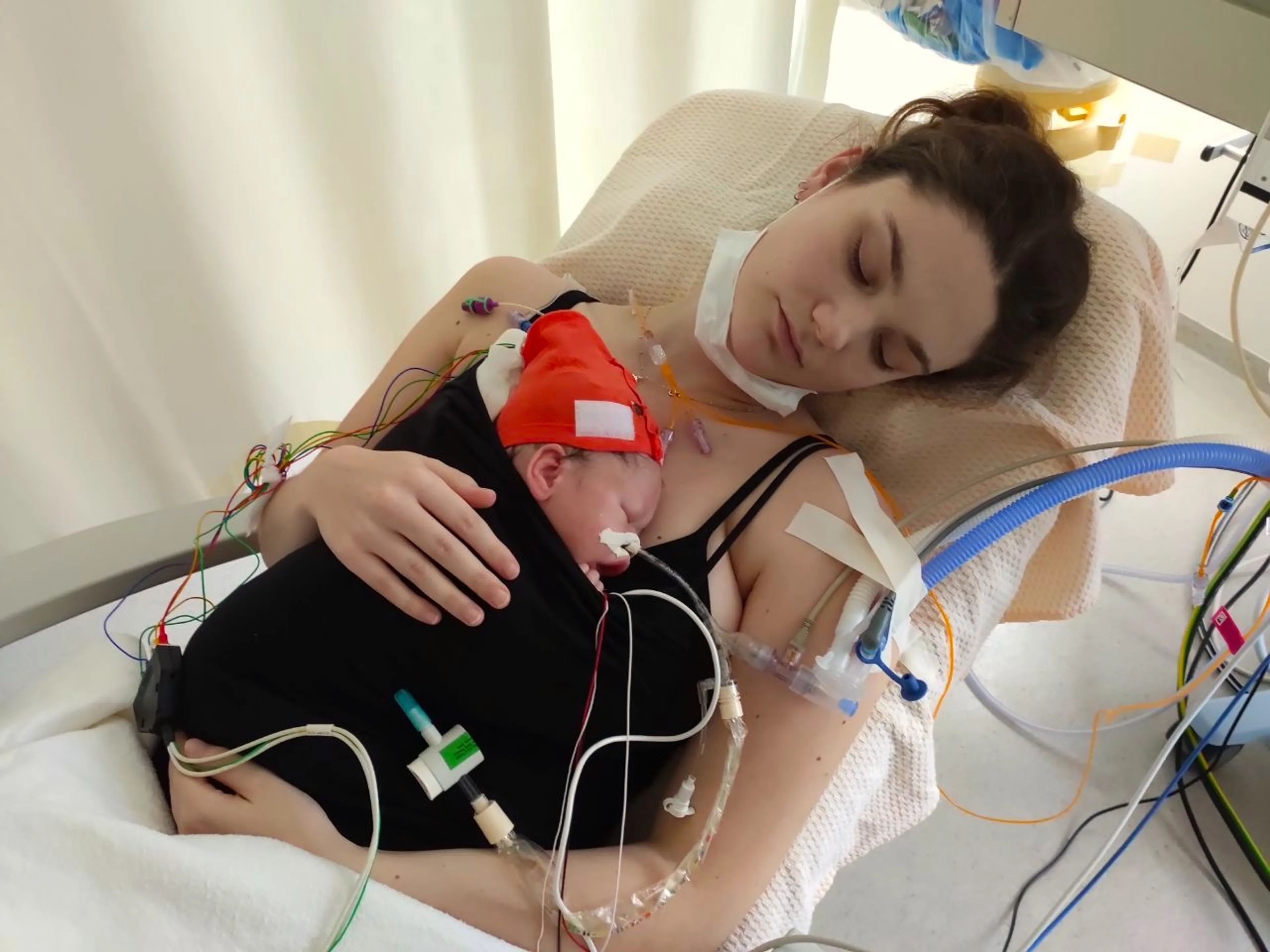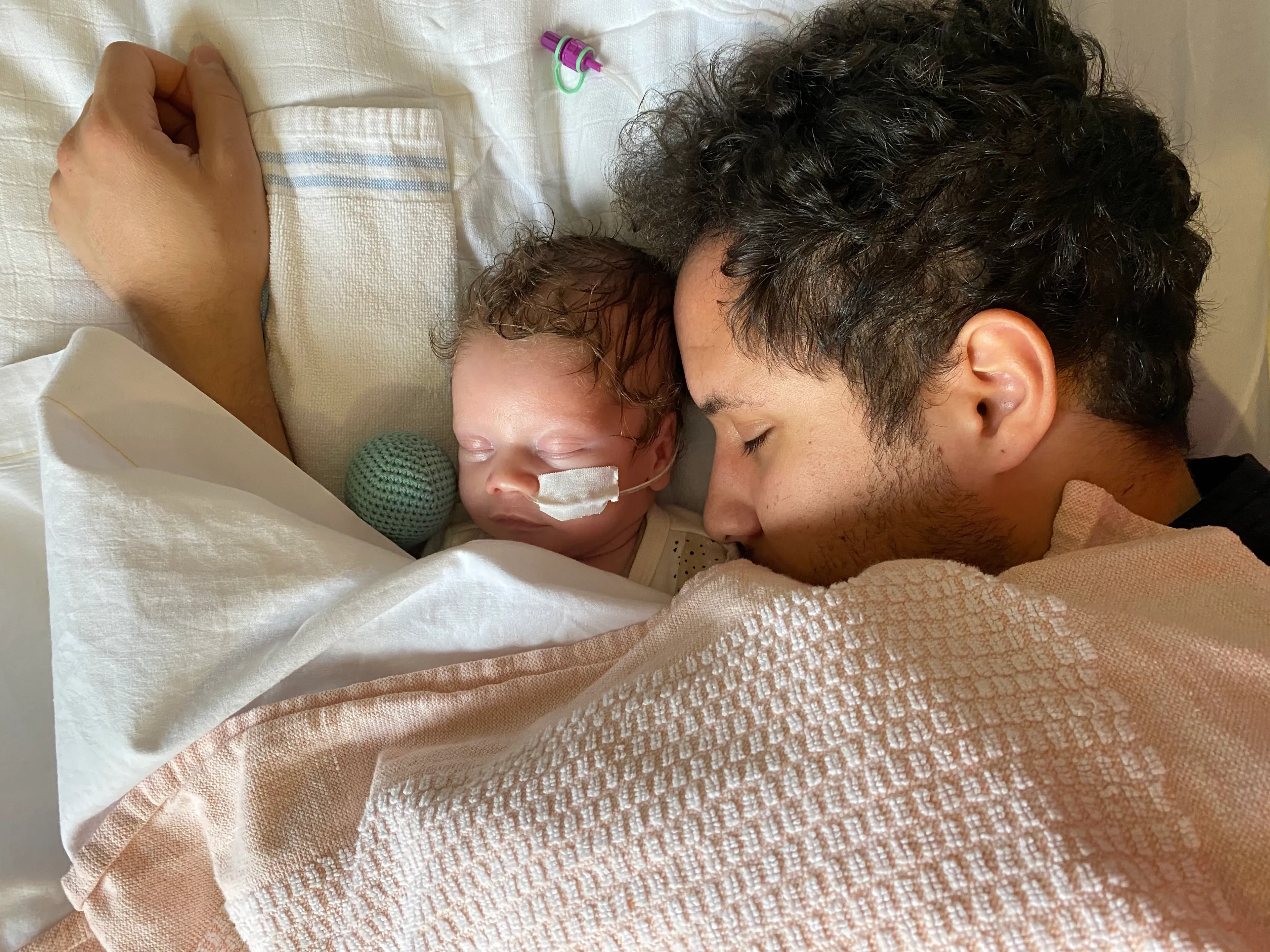 “Ik weet nog dat ik binnenkwam op de afdeling. Ik hoorde Xef al huilen. En daar sta je dan, op zo’n zaal vol kleine kindjes, wetende dat je baby daar ligt. Het was zo onrealistisch. Zijn hoofd vol kleine naaldjes en draadjes. Ik huilde.”
