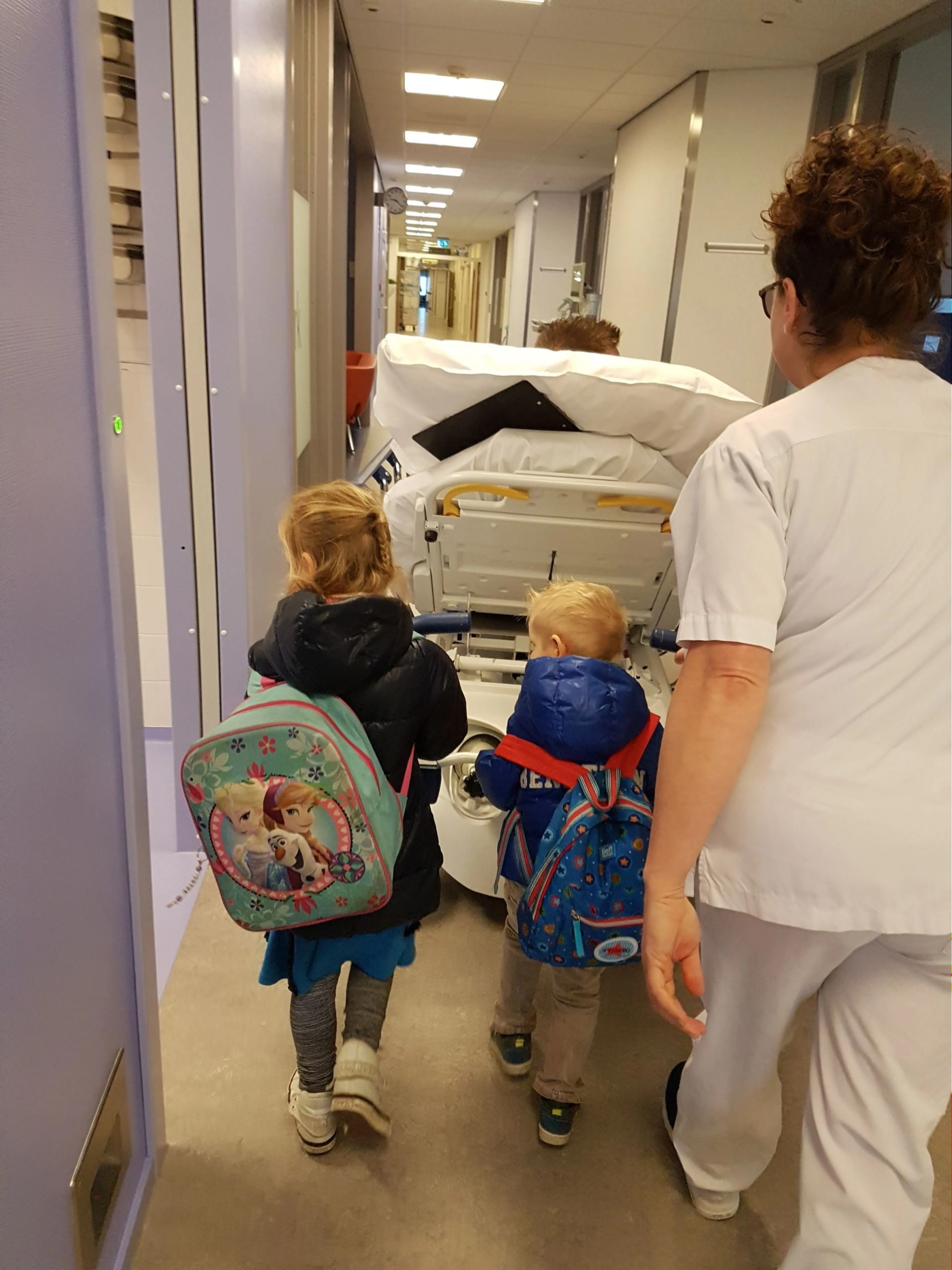 Op de dag van de onderzoeken zijn de kinderen, Joyce en Joey (toen vier en twee jaar), ook mee. “Ik wilde een foto maken van de zuster en de kinderen die het bed met papa duwden. Voor mij is dat een bijzondere foto, want toen was er voor ons gevoel nog niks aan de hand.”
