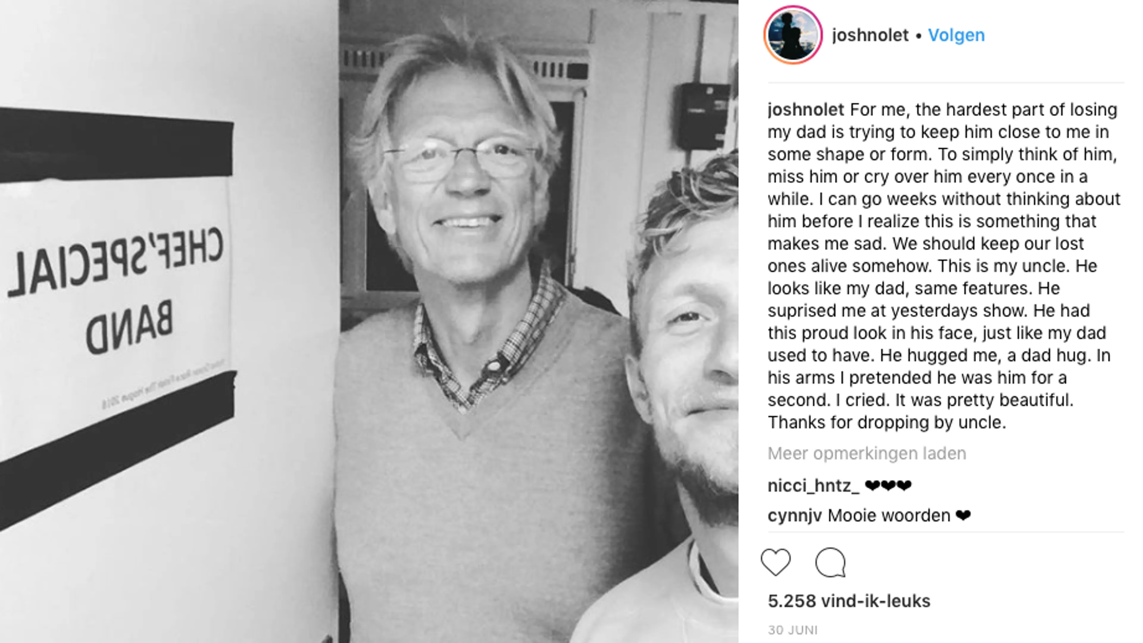 Zanger Joshua Nolet verloor in 2012 zijn vader aan kanker. Onlangs deelde hij een foto op zijn instagram-account van zijn oom die hem verraste tijdens een concert met zijn band Chef’Special. De trotse blik van zijn oom deed hem denken aan zijn vader. Een emotioneel moment volgde…